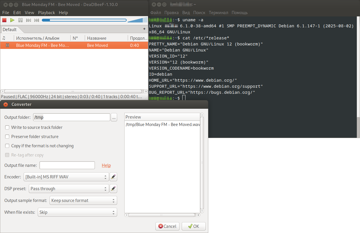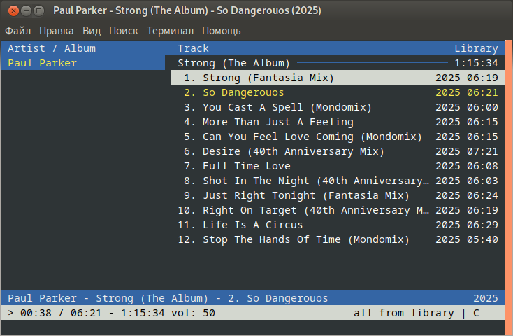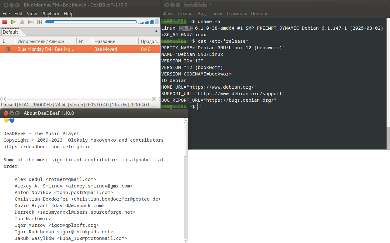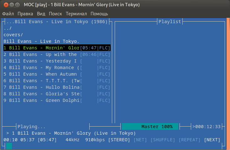 SpringПользуюсь DeaDBeeF уже очень много лет. Наверное, с самых первых релизов. На тот момент, альтернатив ему не было. Это был лучший проигрыватель. Теперь альтернативы есть, однако, он до сих пор остается в ряду лучших, и называть его "поделием" в корне неверно. al.ttovЕсли активно пользуетесь консолью, то горячо рекомендую cmus. На втором месте mocp. Но первый лучше. (Оба есть в стандартных репозиториях Debian.) Ну а с графическим интерфейсом, я уже писал выше, пользуюсь DeaDBeeF. Сделал пару скриншотов, и набросал "курс молодого бойца" по их управлению: cmus