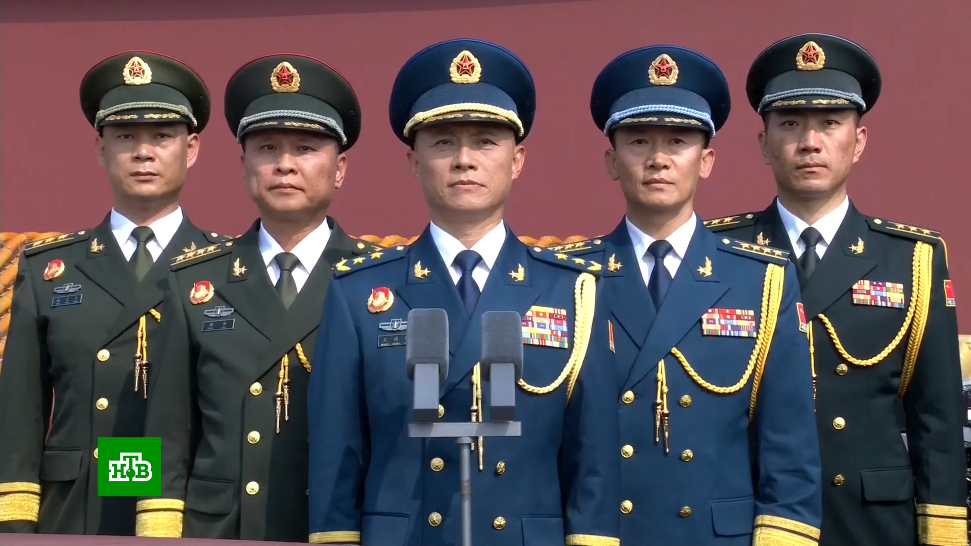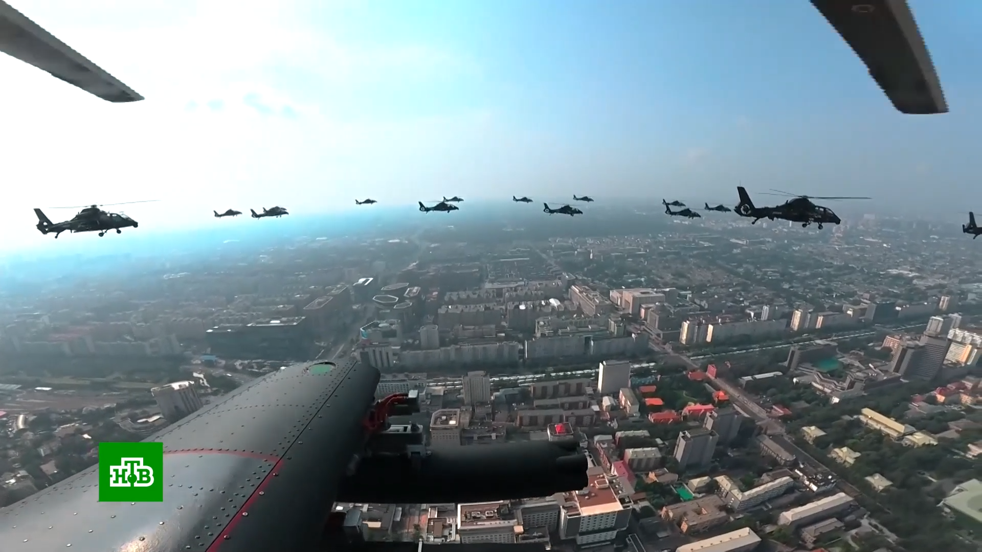 54:39 Над площадью Тяньаньмэнь вертолеты проносят три знамени и рисуют в небе число 80