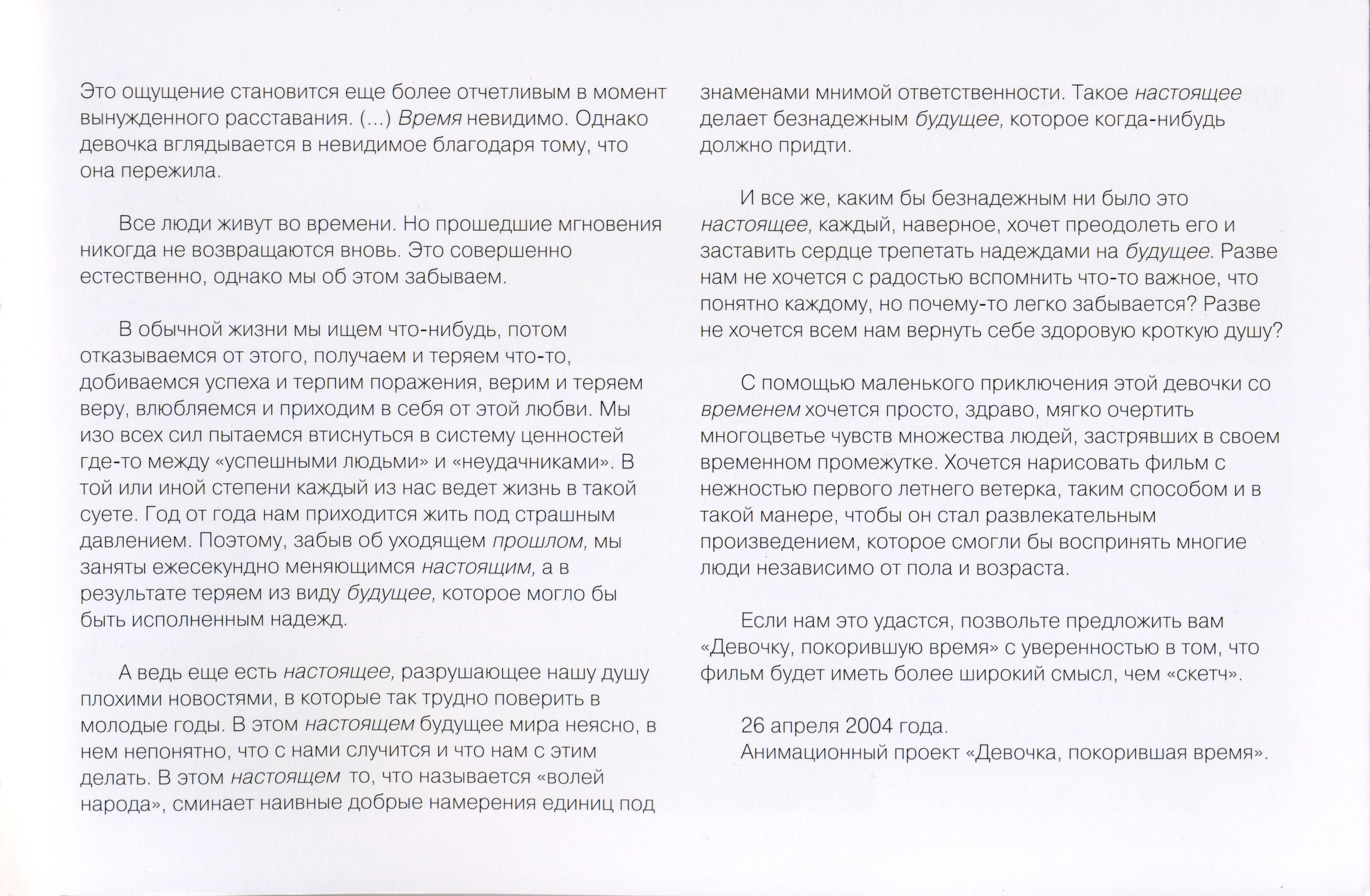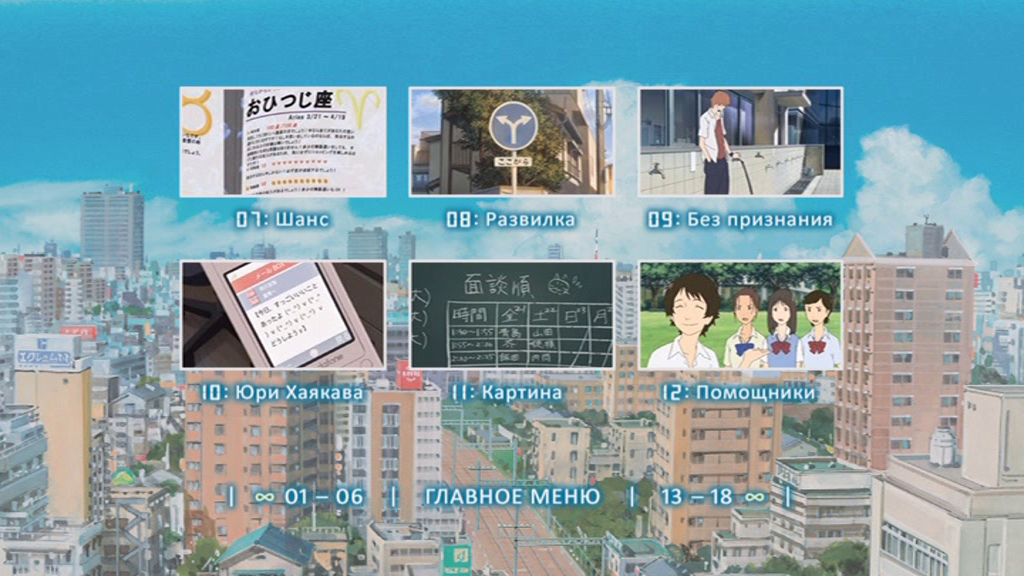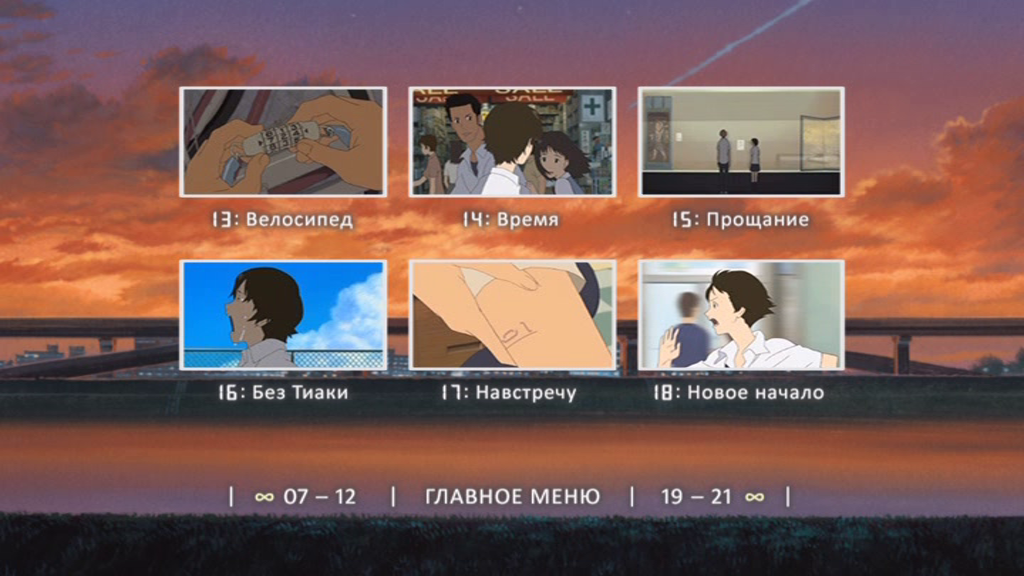Сетка ВещанияОписание:У старшеклассницы Макото не задался день: контрольная написана плохо, на уроке кулинарии сгорела темпура, на перемене ее сбили с ног; после уроков она относила анкеты и растянулась в лаборатории. И, в качестве эффектного завершения дня, у Макото отказал тормоз на велосипеде, причем выяснилось это как раз на железнодорожном переезде, когда поезд уже подходил... Если бы этот день пошел как-то иначе! Если бы можно было хоть что-то переиграть!..
