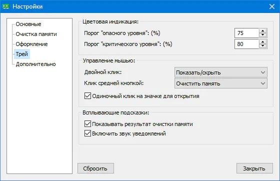 ◦Настройка двойного клика: "Запустить очистку" (без запроса)