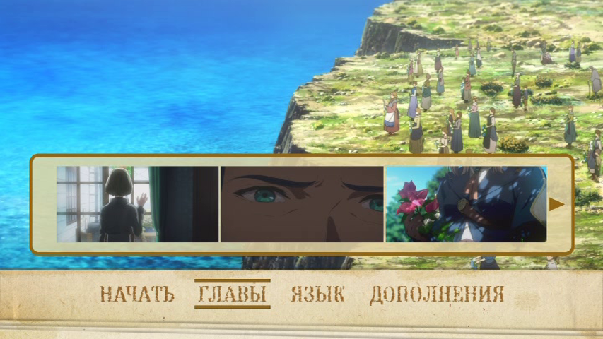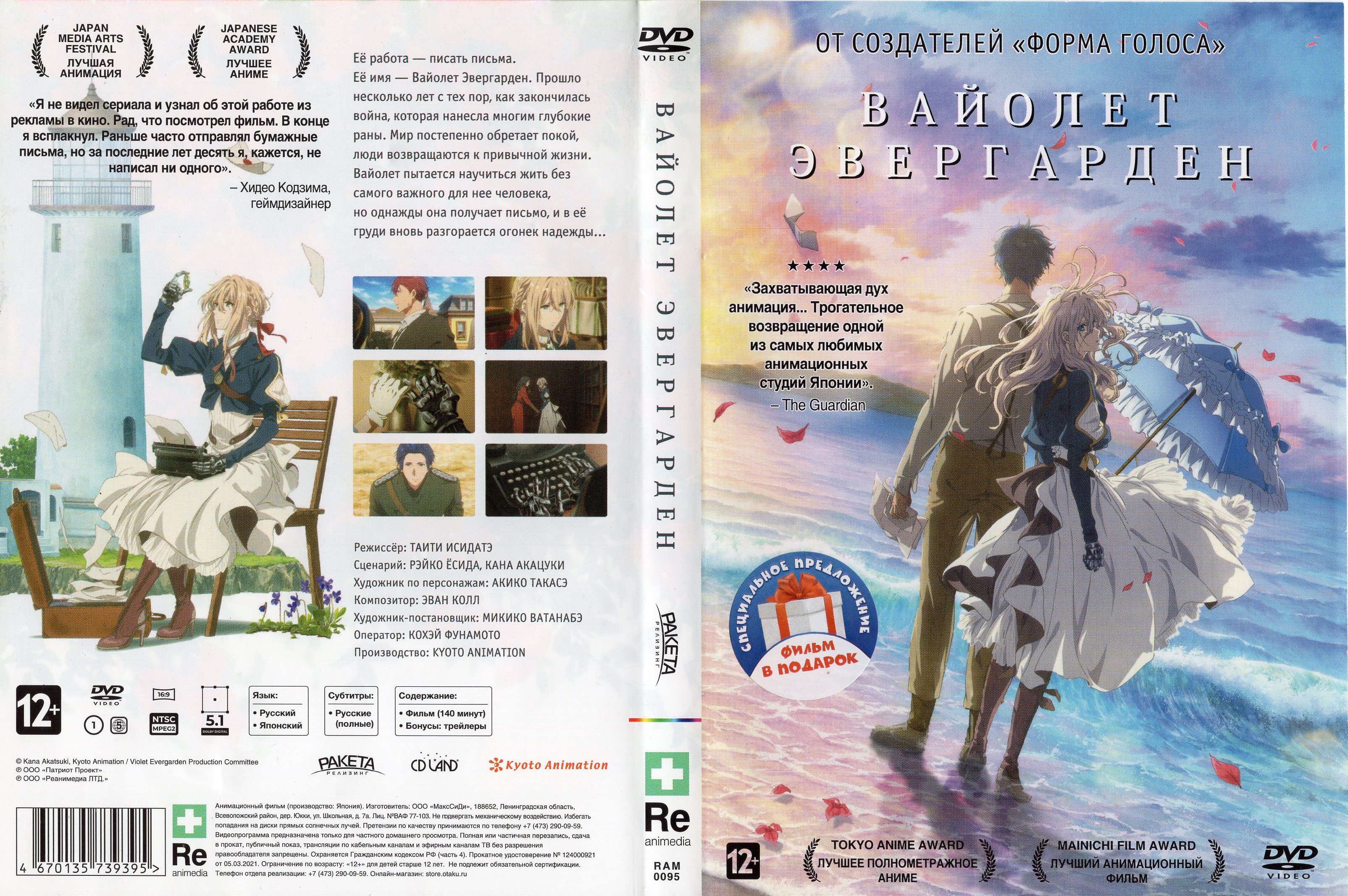 Тип: Полнометражный фильм Жанр: приключения Продолжительность: 140 мин. Дата выпуска: 18.09.2020 г. Производство: Kyoto Animation Автор оригинала: Акацуки Кана Режиссер: Исидатэ Тайти Ссылки: World-Art, ANN, AniDB, MyAnimeList, Сетка ВещанияОписание:Её работа — писать письма. Её имя — Виолетта Эвергарден. Прошло несколько лет, с тех пор как закончилась война, которая нанесла многим глубокие раны. Мир постепенно обретает покой, люди возвращаются к привычной жизни. Виолетта пытается научиться жить без самого важного для нее человека и не обращать внимания на свои чувства. Но однажды она получает письмо, и в её груди вновь разгорается огонек надежды… Язык озвучки: Японский и Русский Субтитры: Русские Перевод: Reanimedia Качество видео: DVD9 by koctik-2017Формат контейнера: VOB Видео: MPEG-2 (Main@Main), 720x480 @ 853x480 (16:9), ~23.976 fps (VFR), ~6491 kbpsАудио 1: AC-3, RUS(int), 5.1, 48.0 khz, 448 kbps | Озвучкa: Дубляж от Reanimedia Аудио 2: AC-3, JAP(int), 5.1, 48.0 khz, 448 kbps | Озвучкa: Original Скриншоты: