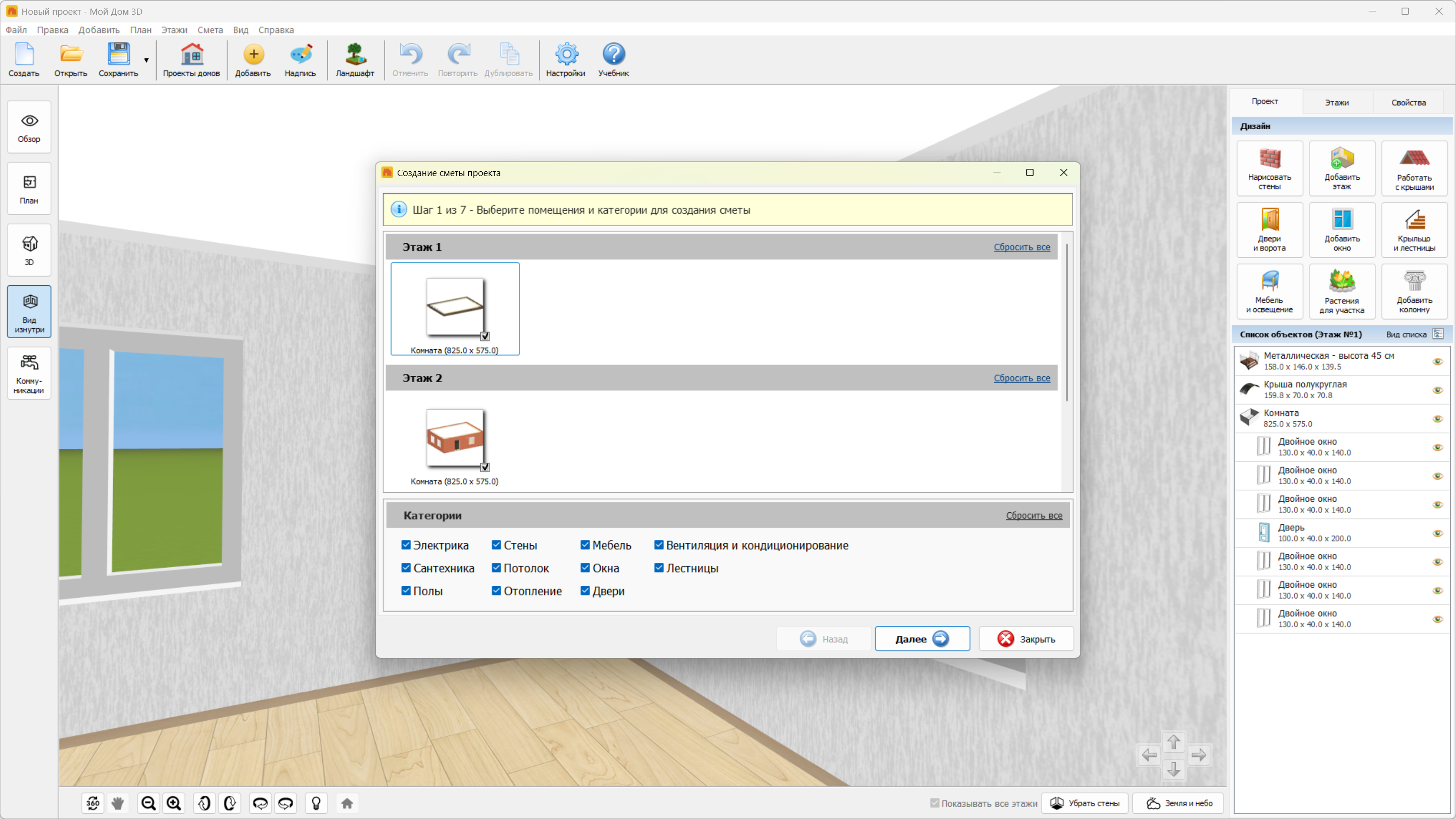 - Составление сметы по этажам и комнатам. Вы сами выбираете категории, которые нужно включить в расчет: электрика, сантехника, полы, отопление, стены и прочее. Впишите необходимые работы и материалы, укажите их количество и цену. Программа подсчитает общую стоимость, и вы сможете спланировать бюджет.