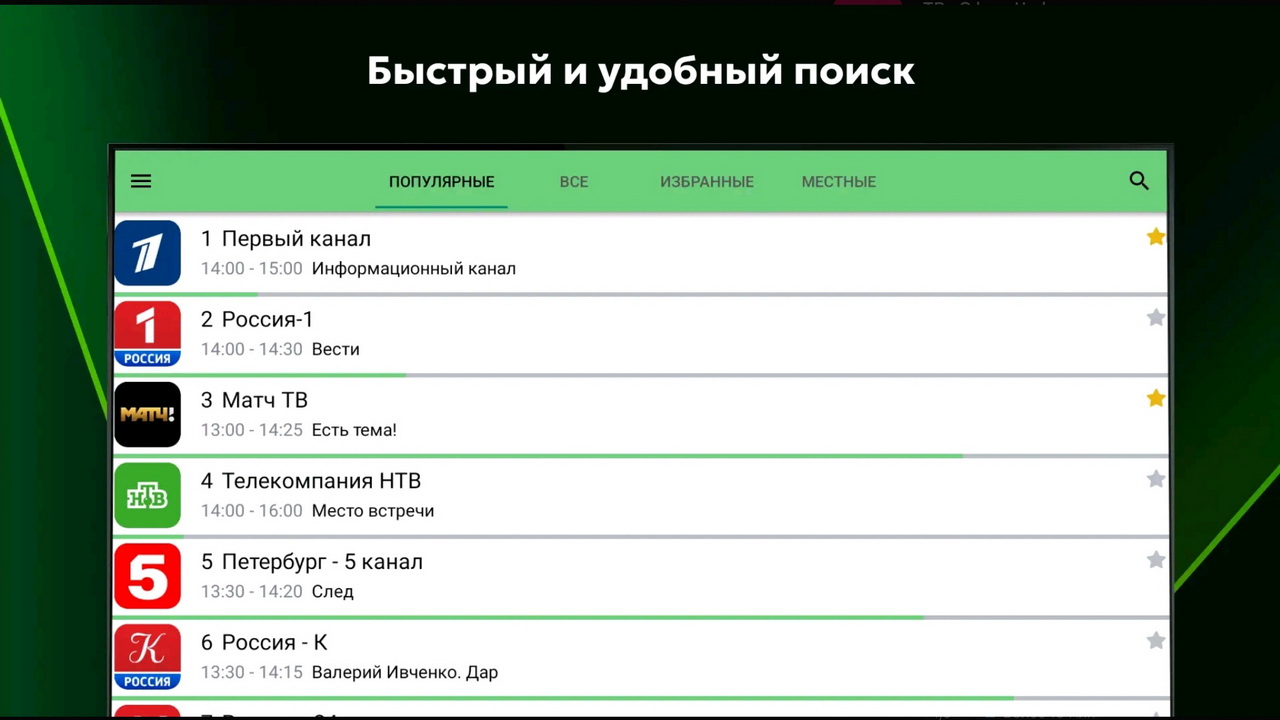 3) Возможность добавлять ТВ-каналы в “Избранное” для быстрого поиска. Выберите любимый телеканал, сохраните его для быстрого доступа и смотрите большое ТВ в любой точке мира.