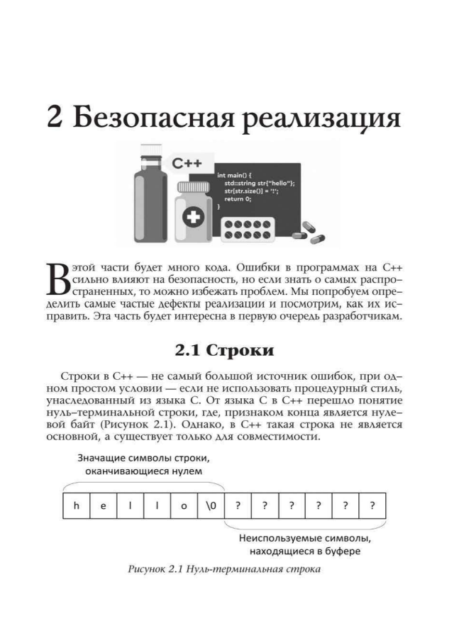 "Безопасная реализация" — в этом разделе раскрываются низкоуровневые вопросы безопасности при написании программ на С++ — здесь о потенциальных проблемах и возможных решениях.