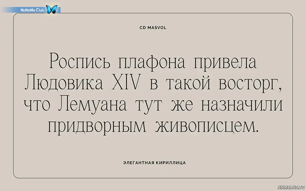 Немного строгий, но в то же время романтичный. Классическая структура делает его элегантный внешний вид вне времени. Красиво смотрится в брендинге и в редакционной обстановке, привлекая внимание, но не подавляя другие визуальные элементы.