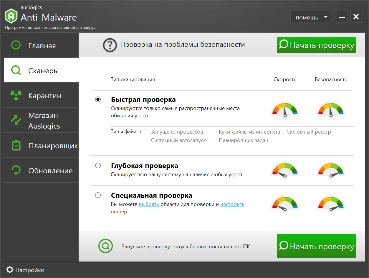 - Auslogics Anti-Malware предлагает три вида проверки:
