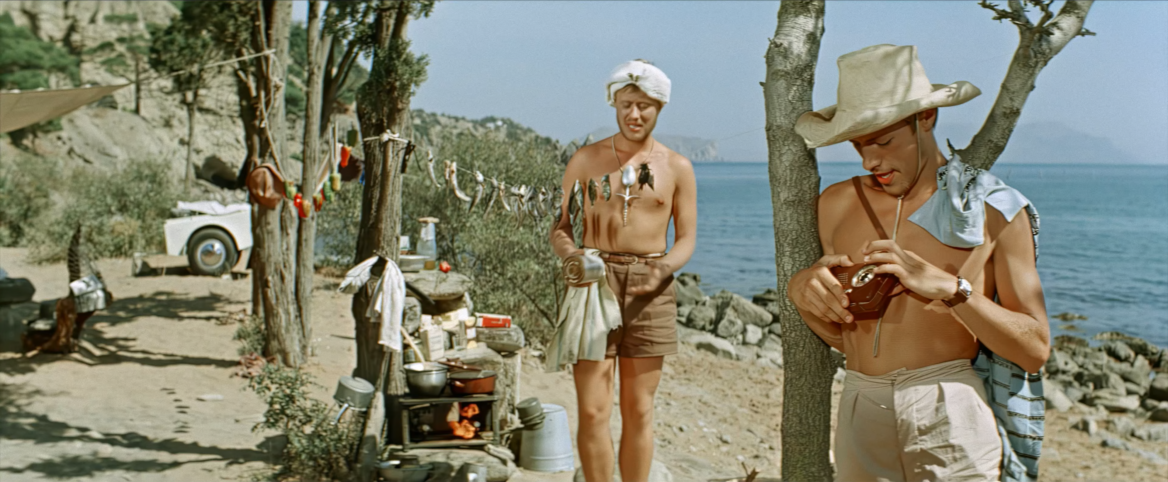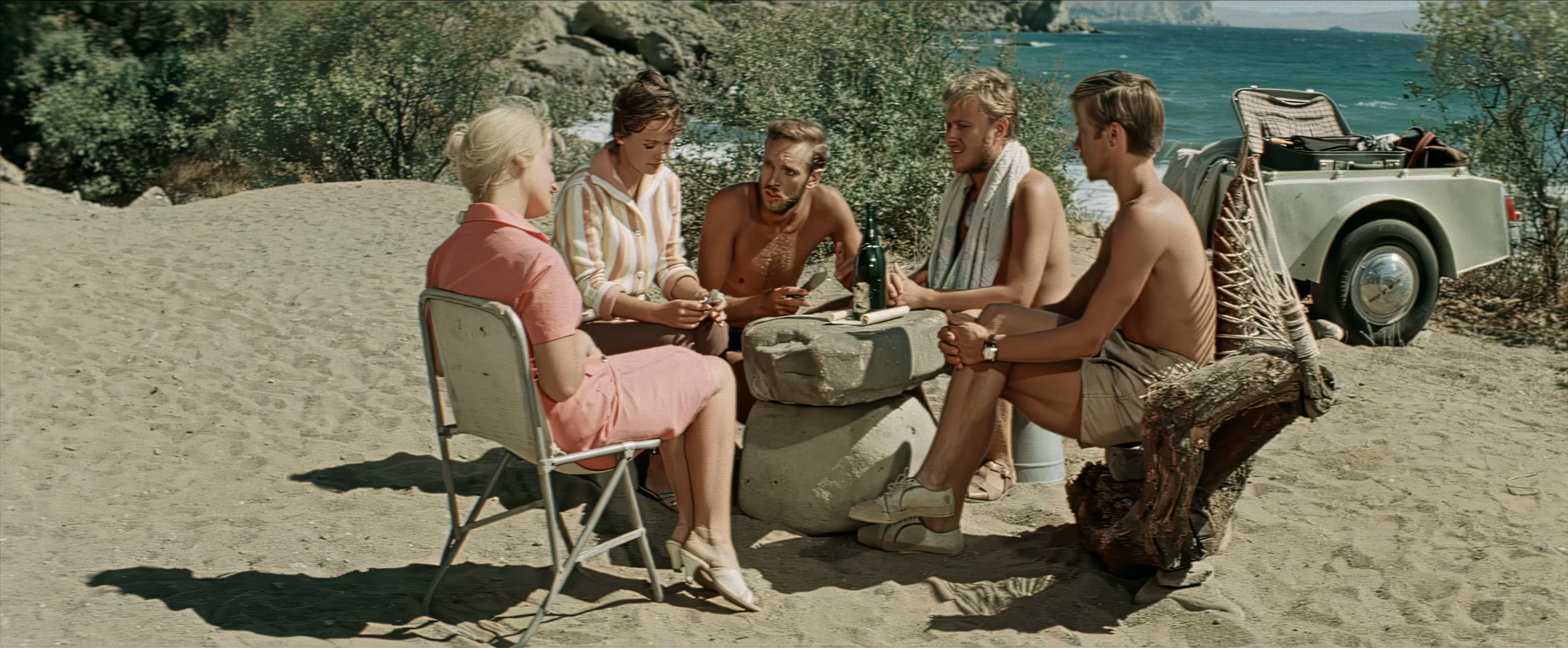 Описание: Трое друзей из Москвы живут «дикарями» в замечательном месте с песчаным пляжем, пресной водой, тенью и дровами у самого моря. Отдыхают. Внезапно приезжают две незнакомки и заявляют, что это их старое место. Более того, они доказывают свое первенство, выкопав бутылку с письмом. Но уезжать ребята отказываются. Дамы же от своего места отказываться тоже не собираются и ставят палатку. Начинается тихая война, перерастающая со временем в любовь.