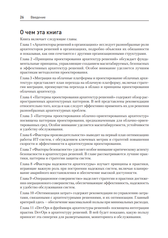 Издание описывает новые интересные возможности, которые позволят вам оставаться в авангарде этой стремительно развивающейся сферы. Большие языковые модели, генеративный ИИ, инновации в области глубокого обучения — все эти революционные достижения формируют будущее технологии. Такие темы, как облачно-ориентированные архитектуры, инженерия данных, облачная оптимизация, модернизация мейнфреймов и создание экономичных и безопасных архитектур, продолжают оставаться актуальными в современной технологической сфере. В книге рассматриваются эти перспективные и ключевые технологии, а также приводится пошаговое описание процесса проектирования архитектур решений, начиная с ключевых принципов. Она снабдит вас знаниями, необходимыми, чтобы стать успешным архитектором решений. Кроме того, книга поможет усовершенствовать гибкие навыки и тем самым получить возможность для развития карьеры.