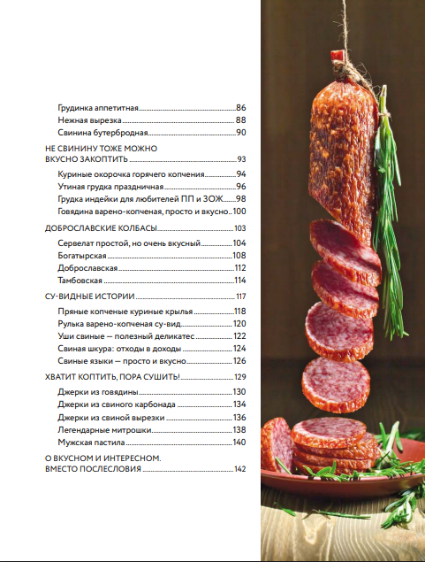 Константин Михайлов, более известный в Сети как Доброслав13, давно занимается изготовлением домашних колбас. В книге он подробно расскажет о технологиях изготовления, выборе ингредиентов и необходимых для безопасности добавках, а также поделится самыми разными рецептами — от простых колбасок для жарки до сервелата и джерки — «мясных чипсов».