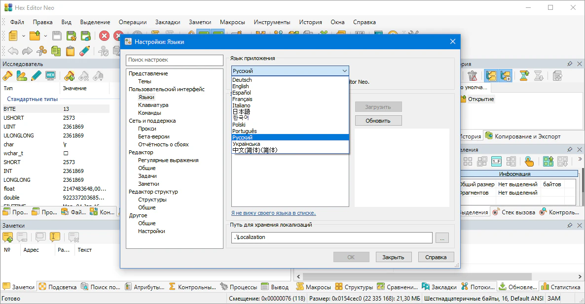 При установке по умолчанию доступен базовый английский язык, для установки русского, украинского и др. языков воспользоваться онлайн установкой нужной локализации через апплет настроек программы. Также можно скопировать папку Localization из раздачи в папку с распакованной программой или в C:\Users\*Имя пользователя*\AppData\Local\HHD Software\Hex Editor Neo\ в случае установки программы.