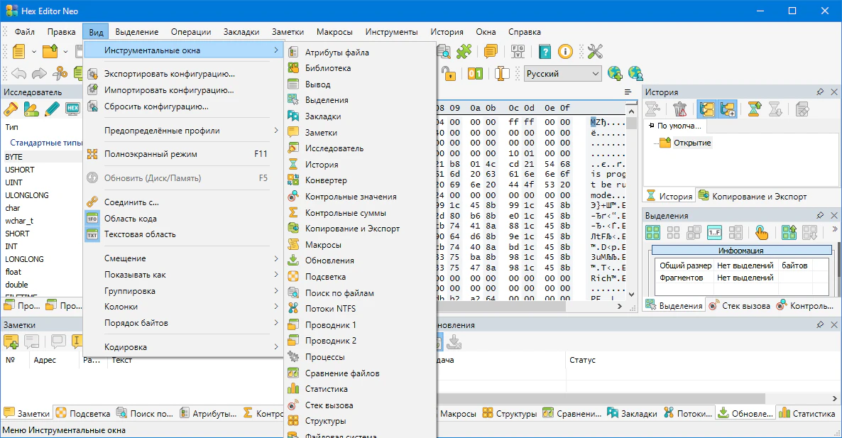 Описание:Hex Editor Neo – Редактор Шестнадцатеричных и Бинарных Файлов под Windows. Программа имеет многооконный интерфейс, возможности по просмотру, поиску, замене и отладке данных.
