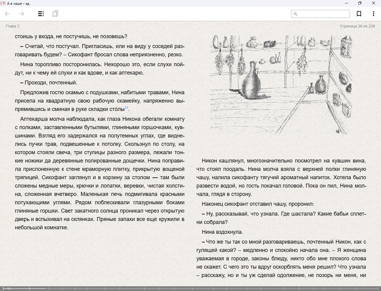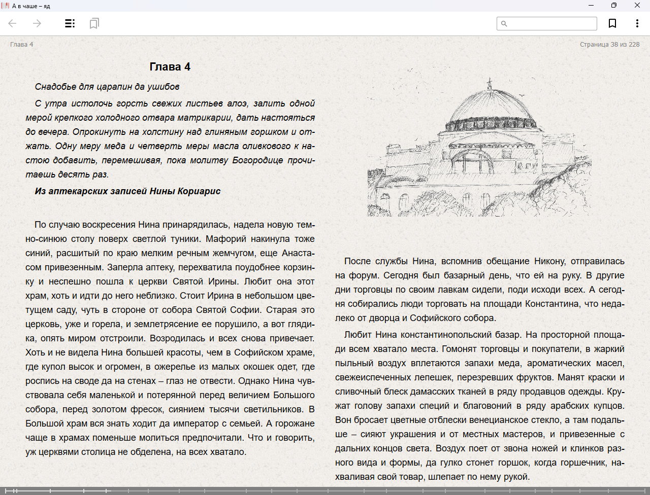 Описание:Жаркий Константинополь. Древняя аптека, запахи трав, глиняные сосуды с отварами. Хозяйку аптеки, почтенную вдову Нину Кориарис, вызывают в гавань, где найдено тело отравленного отрока под городской стеной. Аптекаршу обвиняют в продаже яда. Чтобы защитить себя и сохранить аптеку Нина ввязывается в расследование. Ей теперь тоже грозит опасность. Таинственные отравления и дворцовые интриги вовлекают ее в вихрь событий. Найдет ли она убийцу до того, как он отравит следующую жертву?
