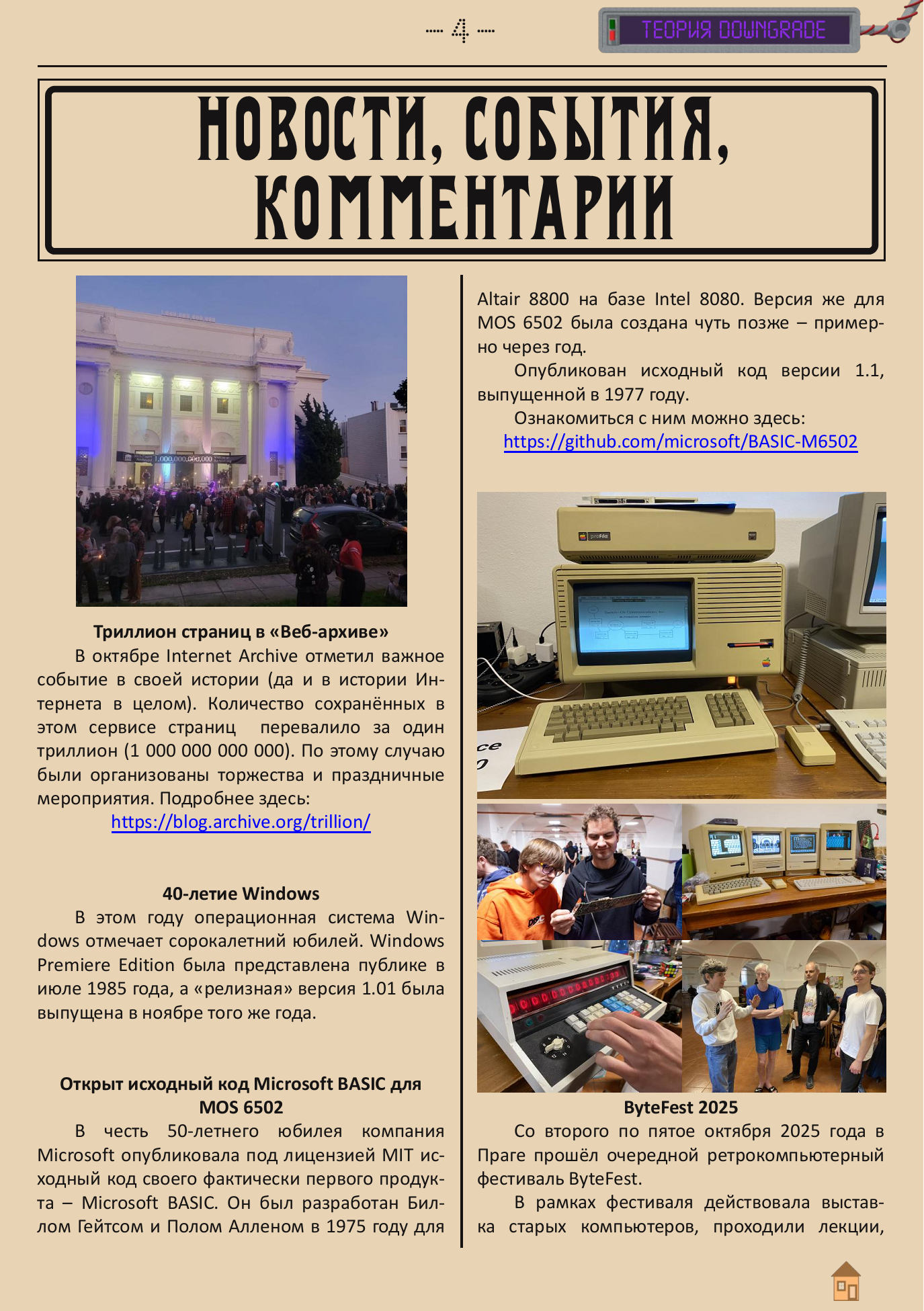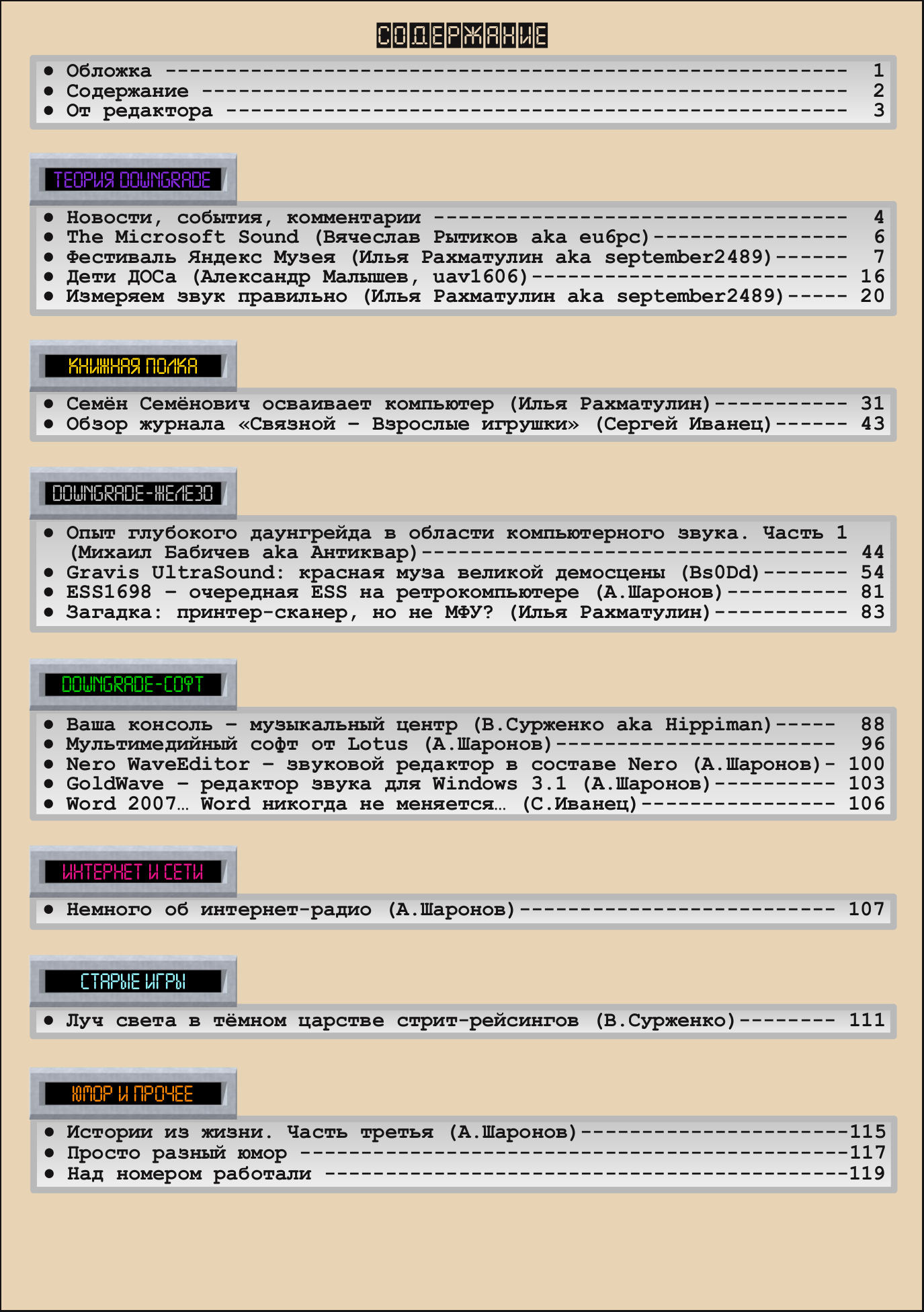 Описание:Журнал "Downgrade" посвящён, в первую очередь, старому программному и аппаратному обеспечению. Но эту тему можно трактовать достаточно широко - сюда можно отнести и использование разных эмуляторов, проблемы запуска старых программ на новых компьютерах (и наоборот), историю информатики и вычислительной техники и т.д.