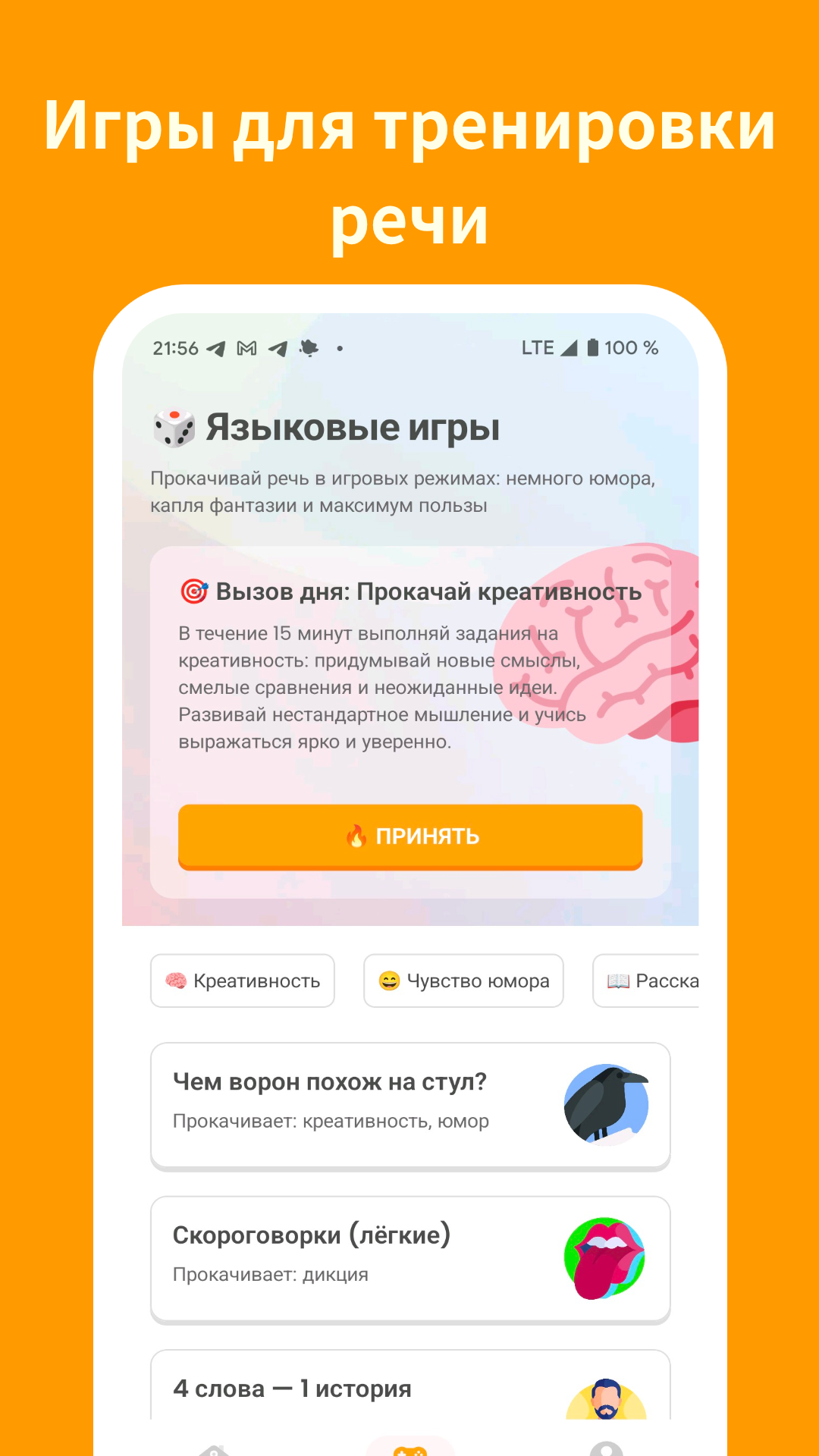 🎮 Языковые игры — развивай спонтанность, сторителлинг, флирт, эмоциональную окраску речи, умение вести диалог в сложных ситуациях.