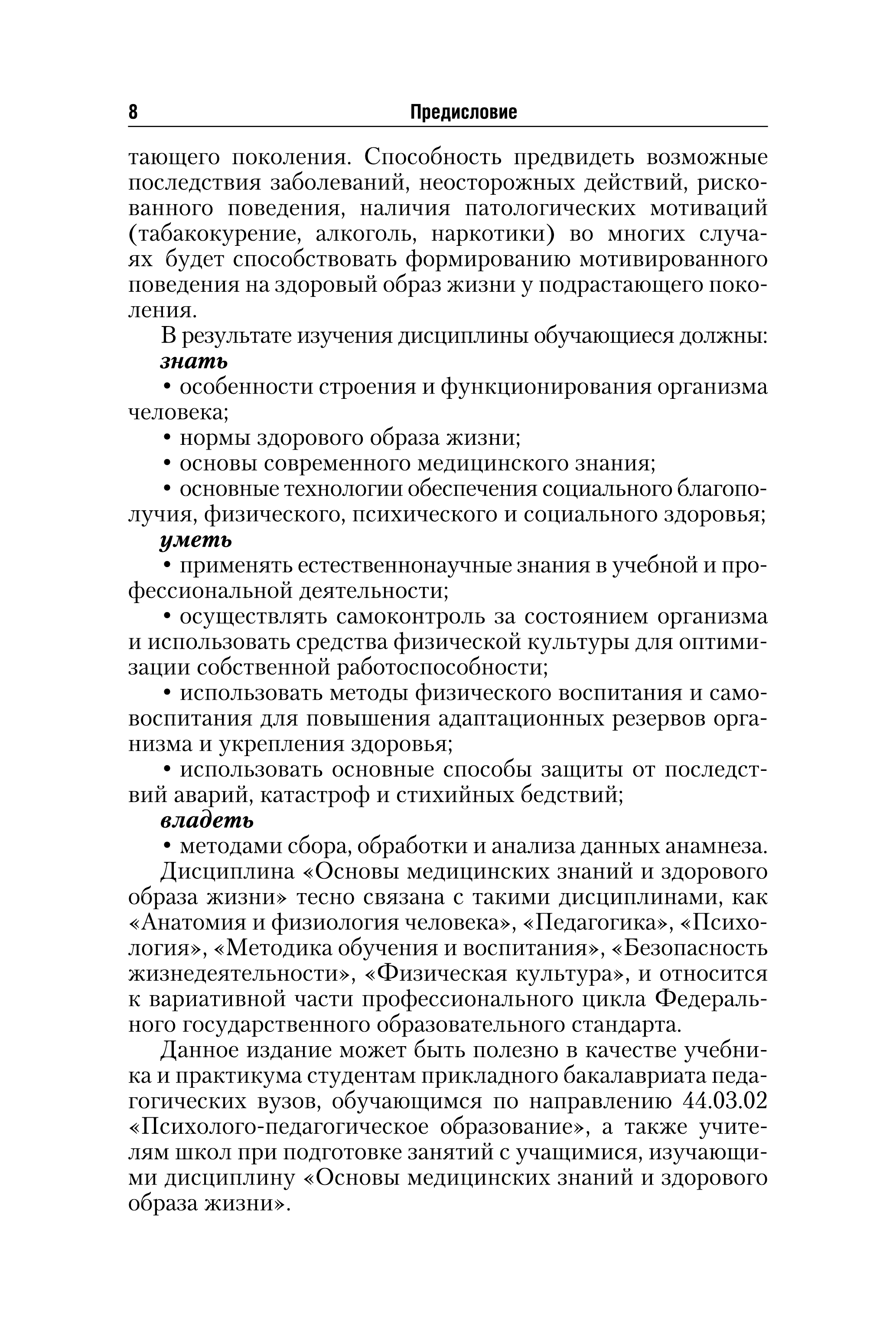 Описание:В курсе освещаются теоретические основы, причины возникновения и развития основных заболеваний человека, их современная классификация, подходы к лечению и способы профилактики. Рассматриваются медико-гигиенические аспекты здорового образа жизни. Особое внимание уделяется комплексу профилактических мер по нераспространению инфекций в детском коллективе, предупреждению детского травматизма и других неотложных состояний и заболеваний с целью сохранения и укрепления здоровья подрастающего поколения.