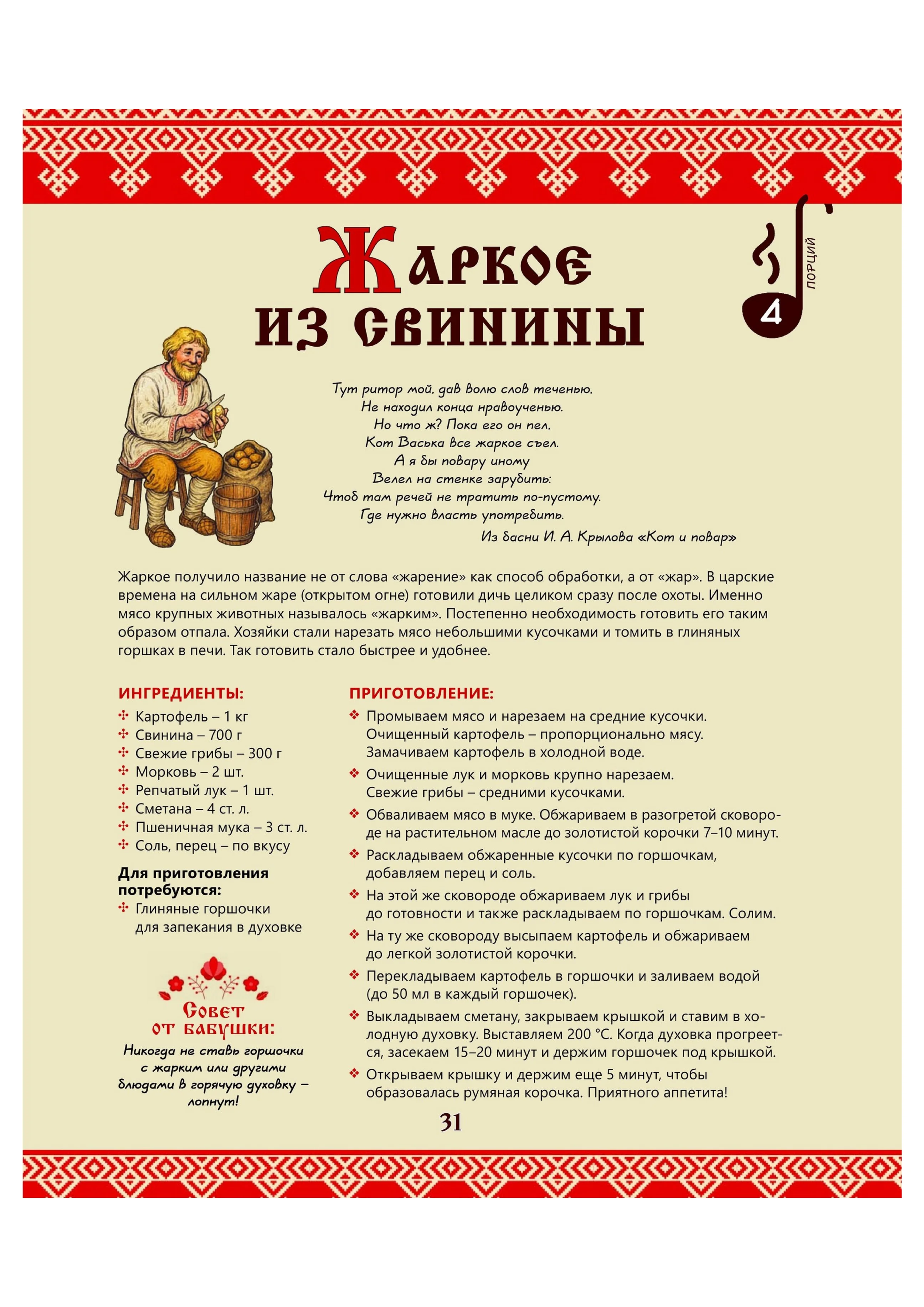 Описание:Издавна в русской культуре пища не только насыщала – это был особый ритуал. Еда придавала сил и оберегала, а хлеб всегда был всему голова. Любовь к традиционной русской кухне воспитывалась в нас с малых лет, и знакомство с родными блюдами началось со сказок. Внутри вас ждут подробные рецепты, исторические справки о блюдах и атмосферные иллюстрации. Готовьте с любовью и помните: не красна изба углами, а красна пирогами. Вспоминая истории из детства, приготовьте вкуснейшие блюда: