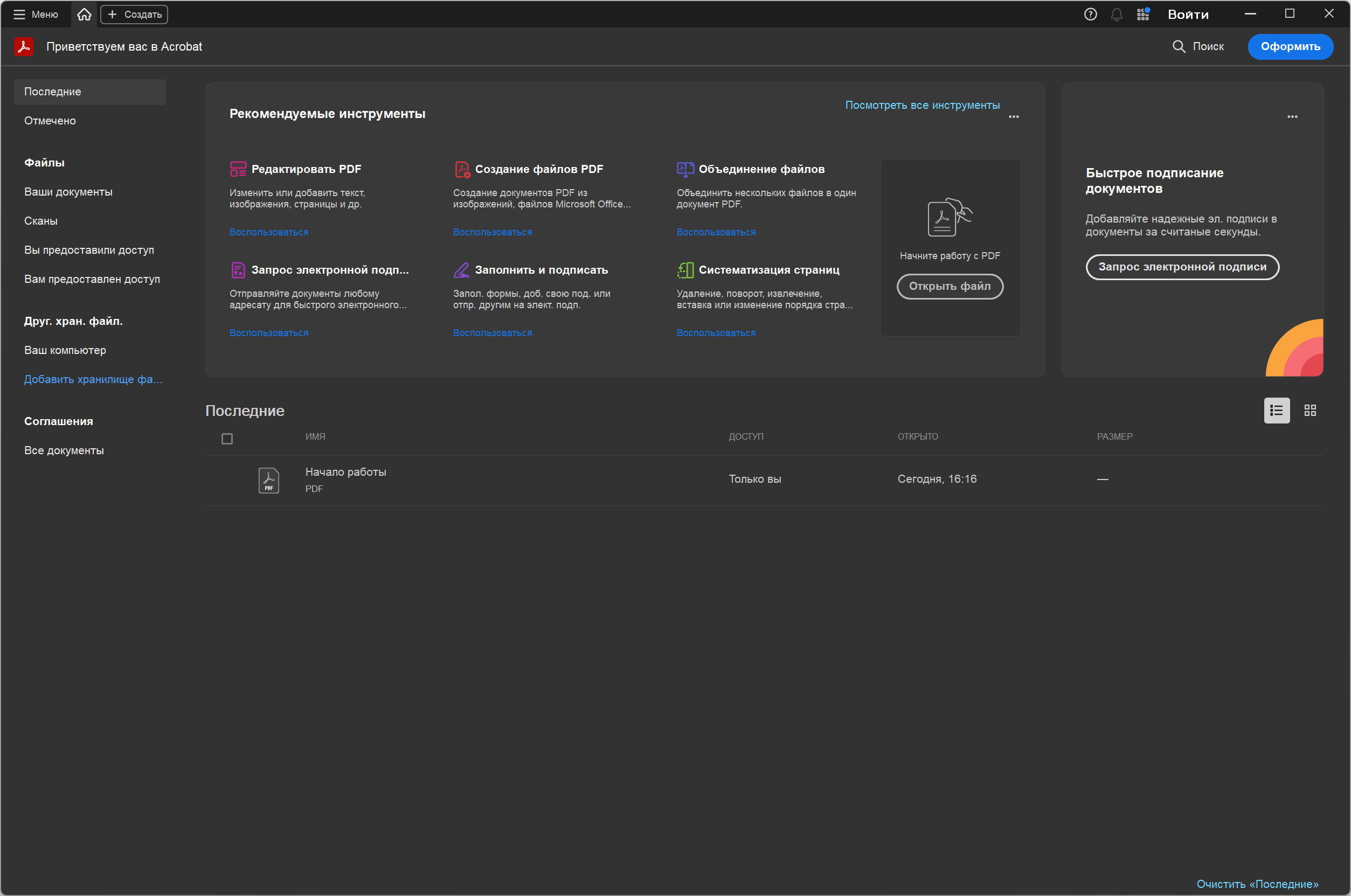 Получайте доступ к инструментам PDF и недавно открытым файлам из офиса, с домашнего компьютера или с мобильного устройства. Воспользуйтесь комплексным решением для работы с файлами в формате PDF, где бы вы ни находились.