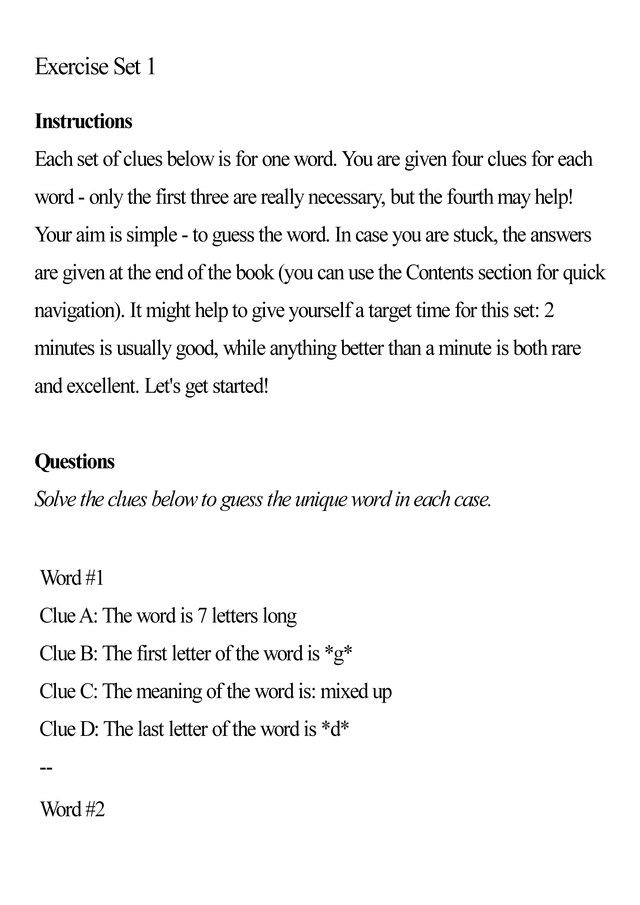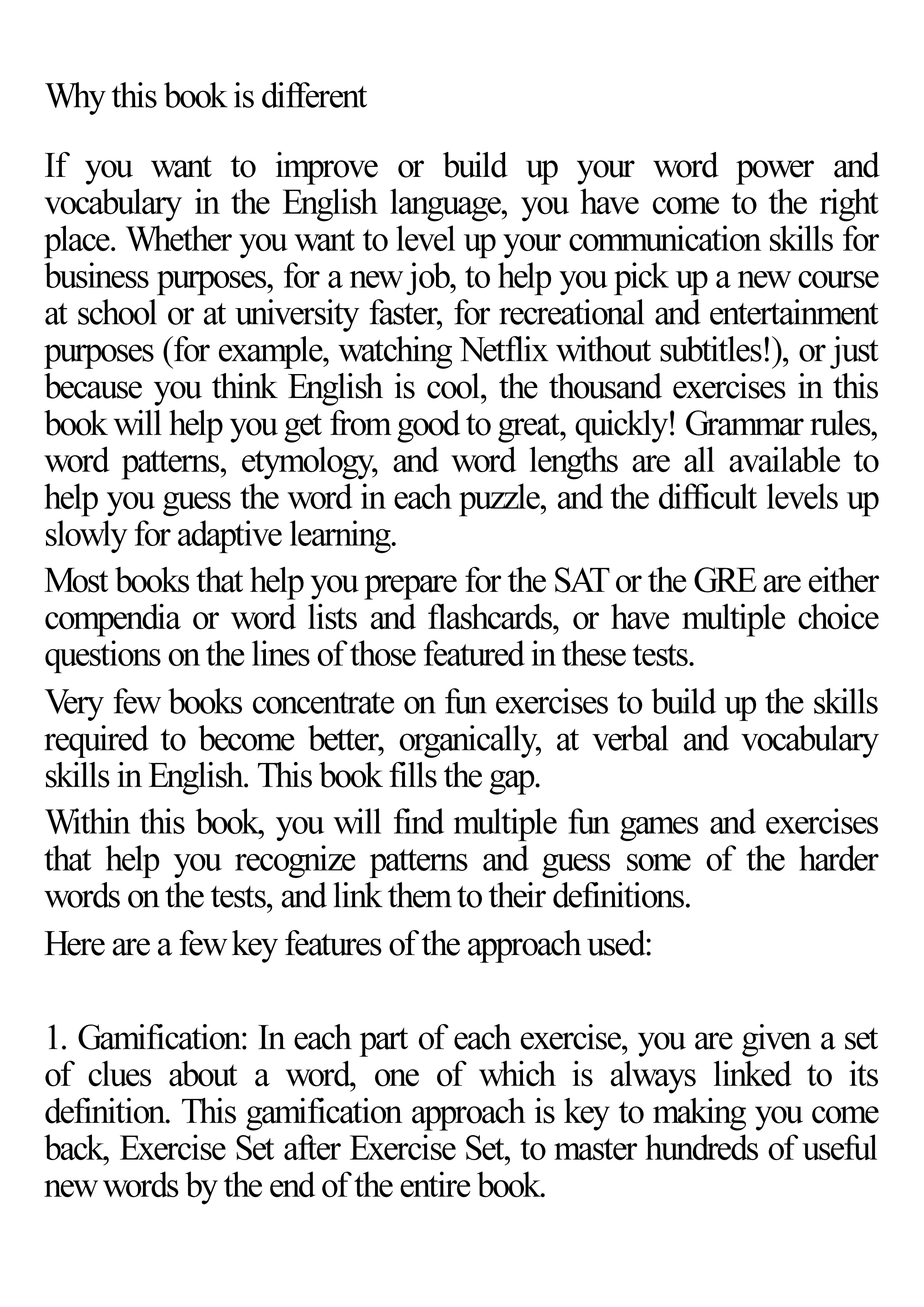 Very few books concentrate on fun exercises to build up the skills required to become better, organically, at verbal and vocabulary skills in English. This book fills the gap.Within this book, you will find multiple fun games and exercises that help you recognize patterns and guess some of the harder words on the tests, and link them to their definitions.Here are a few key features of the approach used:1. Gamification: In each part of each exercise, you are given a set of clues about a word, one of which is always linked to its definition. This gamification approach is key to making you come back, Exercise Set after Exercise Set, to master hundreds of useful new words by the end of the entire book.2. Pattern recognition: The clues are carefully chosen so that they link to key properties of a word that help you remember it quickly in a test scenario. For example, the first letter of a word, its length, and its approximate meaning are all patterns that help us create mental shortcuts to quick + intuitive guesses. These are exactly what the word clues are based on, and they will benefit you in skill building, through an indirect approach - just like working out a group of muscles in the gym gives you muscle gains weeks later!3. Graded difficulty increase: The pool of words used for this book is carefully curated - you will start off with challenging but commonly used words for the most part, and graduate to more obscure words in a slowly staged manner. All the while, we will sprinkle in a few words related to those you have mastered in earlier Exercise Sets, so that you are able to build on what you have learnt earlier. By the end of the book, you will be ready for anything that a real standardized test can throw at you - both in terms of skills and confidence.4. Unique proprietary format: The format of questions used in this book cannot be found anywhere else - it has been tried and tested with thousands of students, and works every single time.Whether you are looking to strengthen your verbal skills in English for a test, or just looking to do this out of interest, this book is for you.