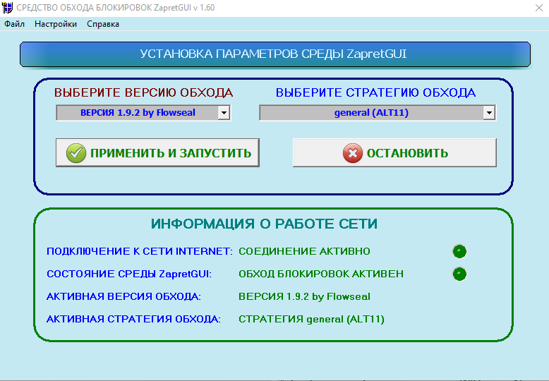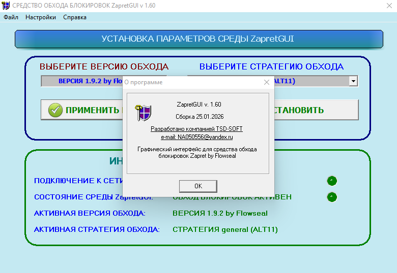 Версия программы: 1.60 Язык интерфейса: Русский Лечение: не требуется Системные требования: Windows 7-10 (32 бит); Windows 7-11 (64 бит) Описание:Программа предназначена для обхода DPI-блокировок (госцензуры с блокировкой сайтов) на базе Zapret. Используются скрипты от сборки Zapret-discord-youtube by Flowseal, а также других авторов. Программа представляет собой графическую оболочку для более удобного запуска скриптов, представляющих собой различные варианты обхода DPI. Графическая оболочка для средства обхода блокировок разработана группой программистов TSD-SOFT под моим руководством. Программа основана на открытом исходном коде, распространяется в комплекте с исходным кодом, полностью безопасна и не блокируется стандартным антивирусом Windows. TSD-SOFT, e-mail: NA050556@yandex.ruПодробную информацию смотрите в файле ReadMe.txt, который распакуется в папку с установленной программой. Вызвать данный файл можно командой ГЛАВНОЕ МЕНЮ-СПРАВКА-ПОМОЩЬ После первого запуска программы настоятельно рекомендуется выполнить сброс сети, а также общий сброс настроек от предыдущих версий обхода блокировок. Для этого предназначена кнопка "СБРОС НАСТРОЕК", находящаяся в окне ГЛАВНОЕ МЕНО---> НАСТРОЙКИ ---> НАСТРОЙКИ ПРОГРАММЫ. По нажатию кнопки "СБРОС НАСТРОЕК", запускается утилита Cleaner for Zapret предназначенная для полной очистки остатков Launcher for Zapret с компьютера, а также если на компьютере использовалась ЛЮБАЯ ДРУГАЯ СБОРКА, основанная на пакете Zapret. Утилита используется для сброса настроек, остановки драйвера WinDivert, очистки реестра от WinDivert. Утилита используется, если пропал интернет или перестал работать обход блокировки с новой версией Zapret или после любой другой сборки Zapret любого автора. Также, при переносе папки с Zapret в другое место, данную утилиту строго рекомендуется использовать для очистки! Zapret GUI 1.60 Добавлена возможность импорта своего файла с IP адресами для разблокировки. Добавлена возможность отключения проверки соединения с Internet. Добавлена возможность работы программы на операционных системах Windows 7 (32/64 бит), Windows 8-8.1 (32/64 бит), Windows-10 (32/64 бит). Исправлены орфографические ошибки в программе и в файле помощи. Zapret GUI 1.50 Добавлена возможность импорта своего файла с доменами для разблокировки. Добавлена возможность выбора версии обхода для разблокировки. Можно пробовать старые и новые версии с различными стратегиями. Исправлены орфографические ошибки в программе и в файле помощи. 1) Выбрать дистрибутив из папки, соответствующей вашей системе и разрядности. Пакет INSTALL_ZapretGUI_Win7_8_81-x86_x64 предназначен для установки на операционные системы Windows 7 – Windows 8.1 разрядностью 64 бит. Пакет INSTALL_ZapretGUI_Win7_8_81_10-x86 предназначен для установки на операционные системы Windows 7 – Windows 10 разрядностью 32 бит. Пакет INSTALL_ZapretGUI_Win10_Win11-x86_x64 предназначен для установки на операционные системы Windows 10 – Windows 11 разрядностью 64 бит. Для папки, в которую установлена программа, должны быть выставлены полные права на чтение и запись. Программа работает только под пользователем, находящимся в группе «Администраторы» системы! 2) Для работы приложения в среде Windows 7 необходимо обновление kb3033929, включающее поддержку шифрования SHA-256. Если оно не установлено, следует его установить из соответствующей папки. 3) Для работы приложения на любых операционных системах необходимо наличие пакета Microsoft .NET Framework 4.8. Установщик пакета находится в соответству