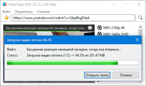 Описание:MassTube — очень простая в использовании программа для скачивания видео с YouTube (и не только) с помощью одного клика. Достаточно в строку поиска вставить адрес понравившегося ролика и нажать поиск, после чего программа предоставит список форматов и разрешений, в которых можно быстро скачать данный клип.