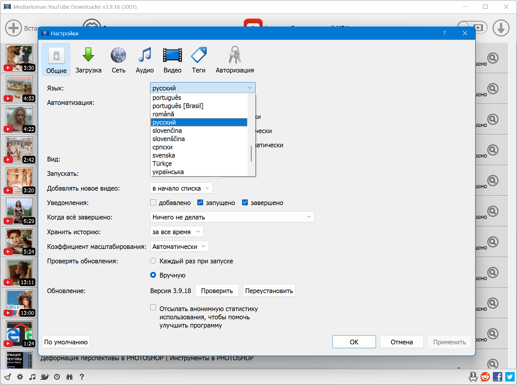 Плейлисты и каналы Программа поддерживает загрузку всех видео из плейлиста или канала. Также есть функция слежения за выбранным каналом или плейлистом с последующей загрузкой новых роликов.