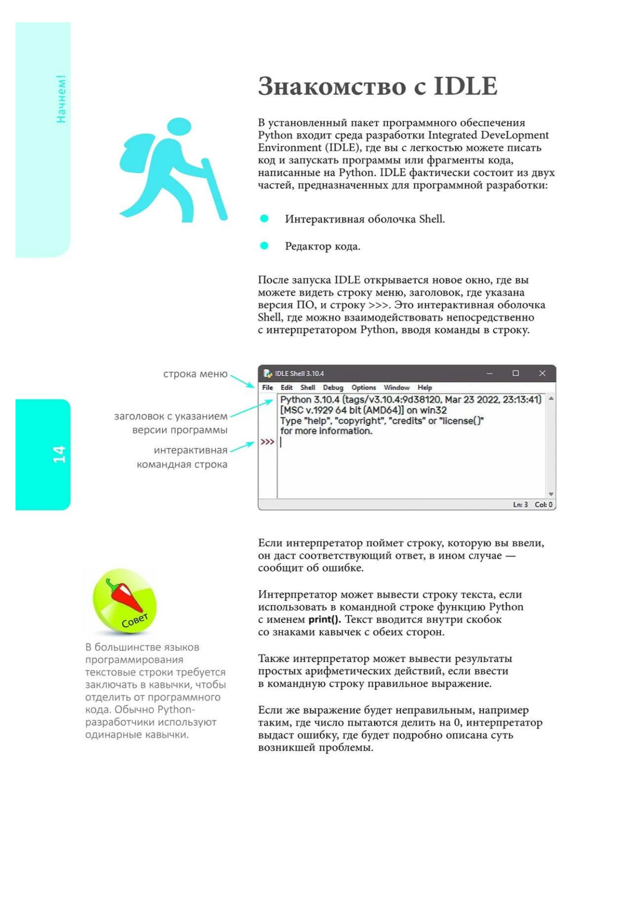 Описание:Открывать новое бывает непросто, но с «Программированием для начинающих» вы легко погрузитесь в мир ИТ даже при отсутствии опыта. Следуйте понятным инструкциям, выполняйте интересные практические задания. Внутри есть вся необходимая информация, рассмотрены ключевые концепции разработки и подобраны наглядные цветные примеры. Вы научитесь: писать программный код на Python, хранить информацию в структурах данных и создавать алгоритмы в рамках объектно-ориентированного программирования. Смело воплощайте свои идеи в код!