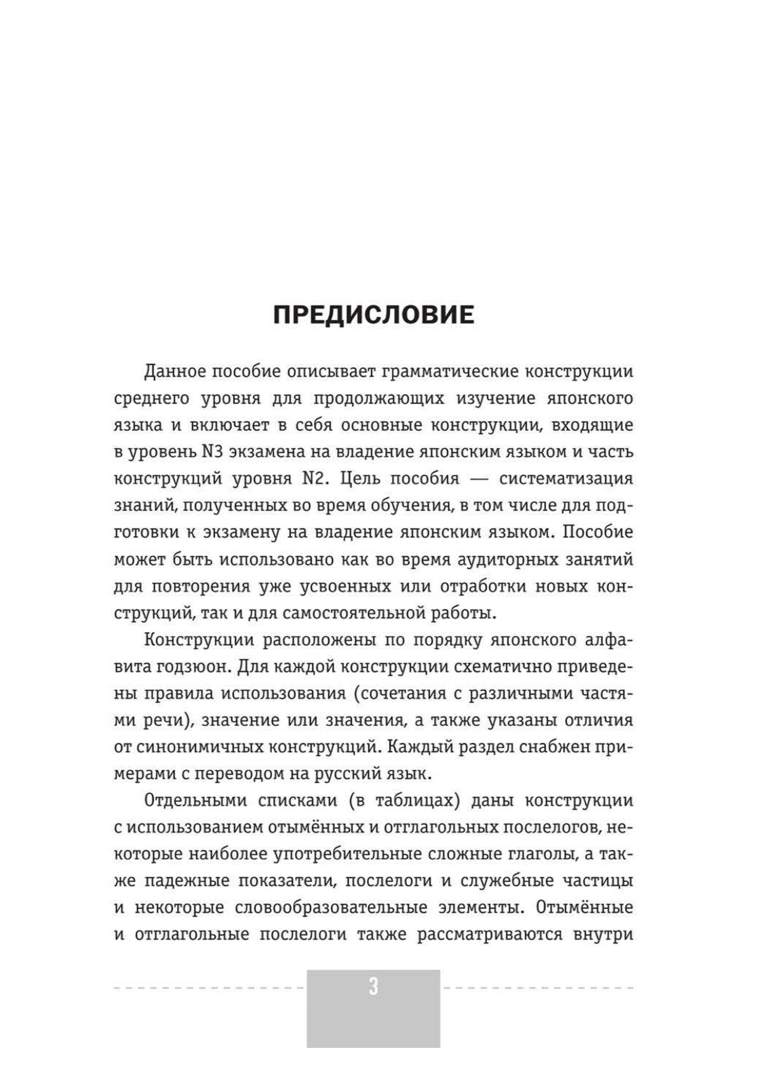Данное учебное пособие содержит грамматические конструкции среднего уровня для продолжающих изучение японского языка и включает в себя основной грамматический материал, входящий в уровень NЗ экзамена на владение японским языком и часть конструкций уровня N2. Цель пособия - систематизация знаний, полученных во время обучения, в том числе для подготовки к экзамену на владение японским языком.