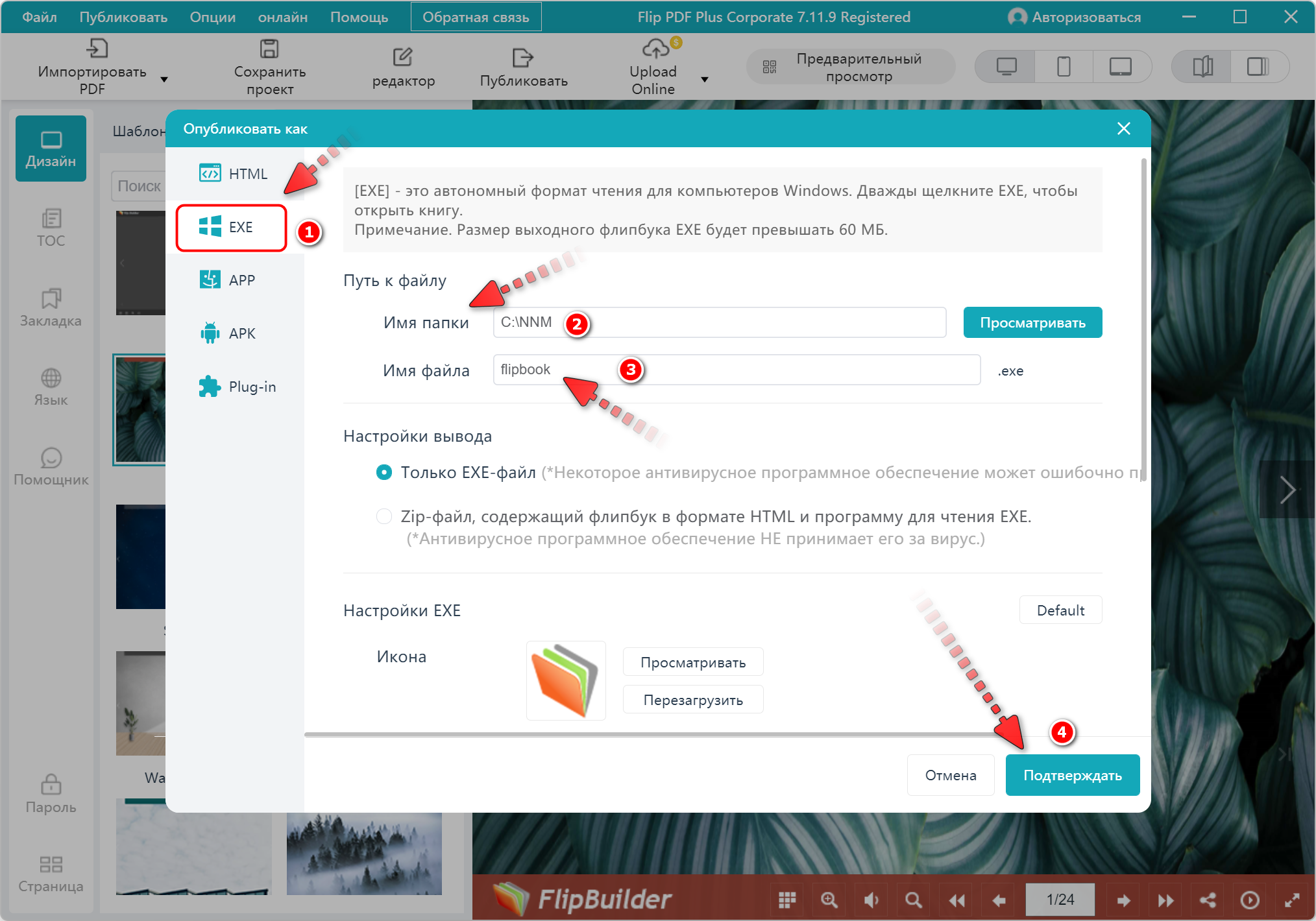 - EXE позволяет вам просматривать готовую книгу на компьютере с ОС Windows.