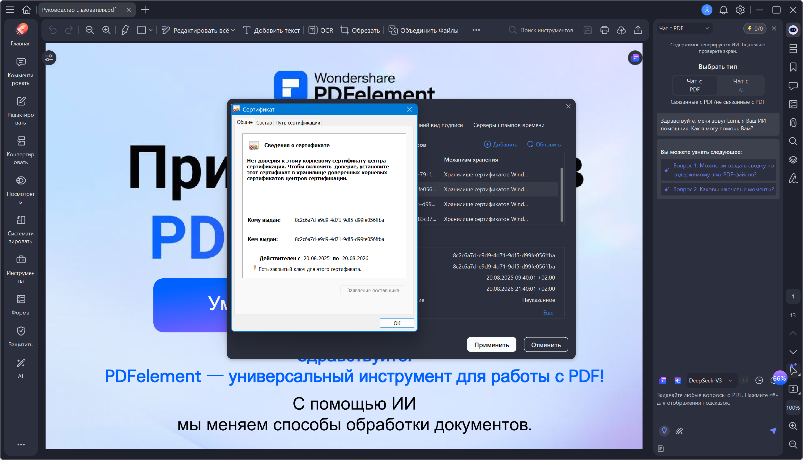 Описание:Wondershare PDFelement - программа для общего редактирования документов формата PDF, инструмент из серии все-в-одном. В функции редактирования входит поддержка изменения текста и шрифта. Реализована поддержка технологии OCR (оптическое распознавание символов), есть режим конвертирования документа в различные форматы, имеется поддержка добавления своих картинок в документ, можно нумеровать страницы для быстрого перемещения в дальнейшем. Wondershare PDFelement может добавлять нужные Вам формы на страницы документа, есть режим позволяющий соединить несколько документов в один, конечно не обошлось и без возможности добавлять свои аннотации. При желании документ можно после редактирования защитить паролем и установить цифровую подпись. - Редактирование