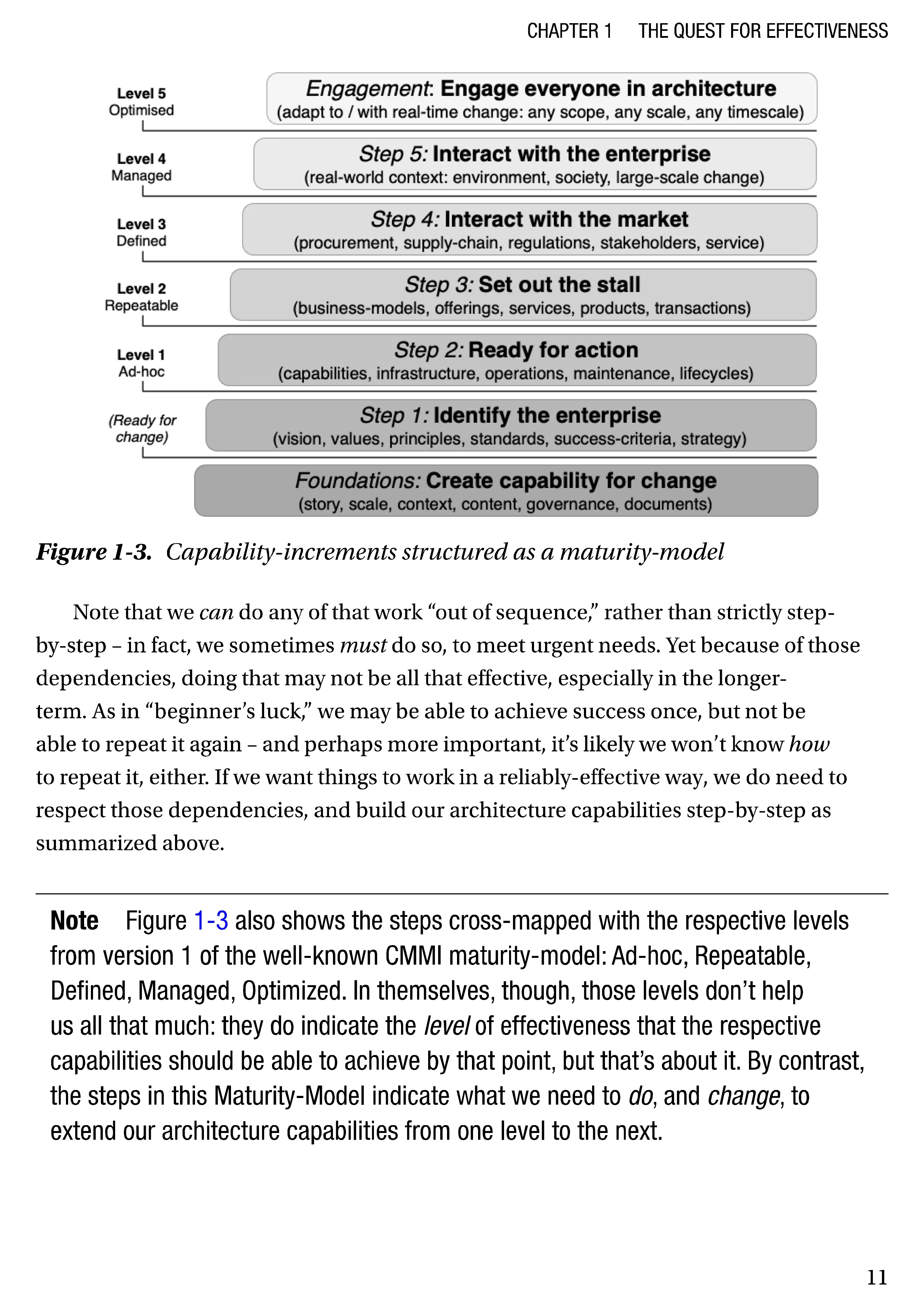 The book describes how to satisfy all of those needs, using a formal dependency-driven maturity-model to guide systematic step-by-step development of the organization’s capabilities for enterprise architecture. The sequence of steps ensures that, at each stage of development, the architecture can be relied upon to achieve desired, effective business outcomes.