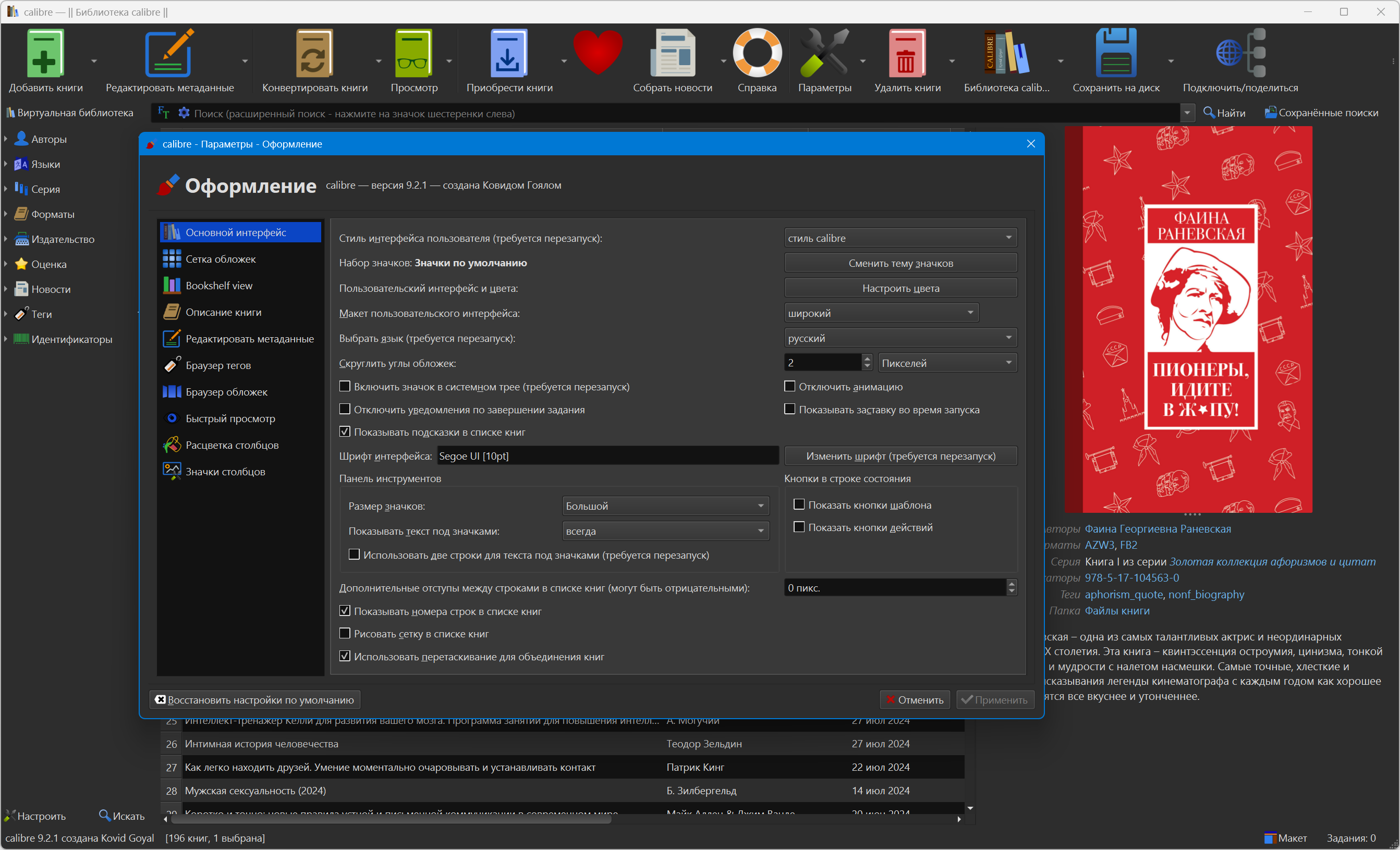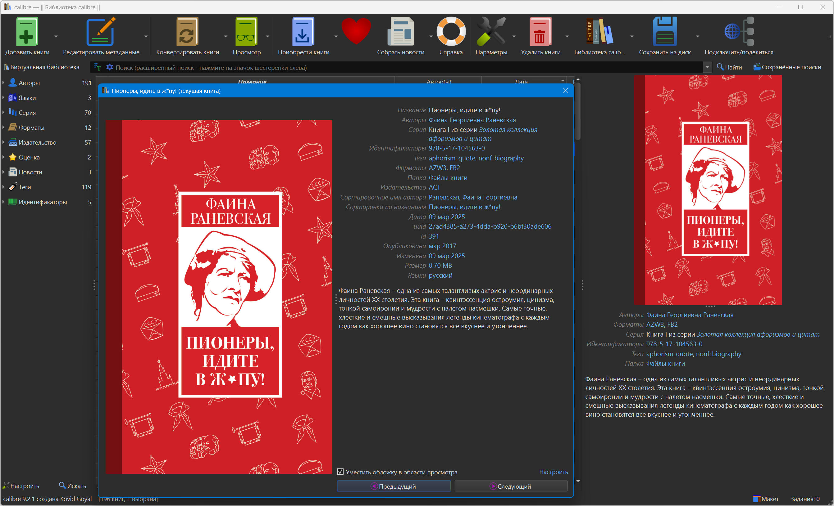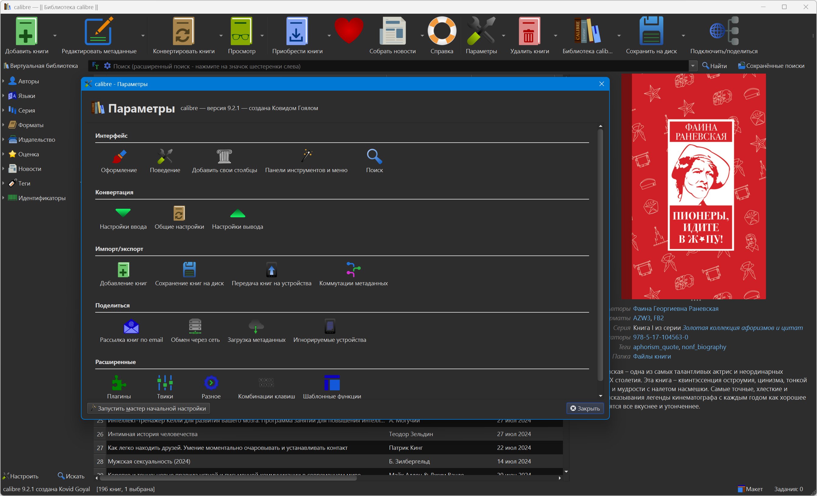 Версия программы: 9.2.1 Официальный сайт: Kovid GoyalЯзык интерфейса: Русский, Английский и другие Лечение: не требуется Системные требования: Описание:Calibre - простая и удобная программа для управления библиотекой и универсальный конвертер электронных книг с большим количеством возможностей. Программа поможет упорядочить вашу библиотеку книг без особых трудностей. Также в её состав входят: утилита для преобразования одного формата в другой, интегратор новостей, программа для синхронизации данных с электронным устройством для чтения и хороший просмотрщик. Она просто необходима поклонникам чтения книг на переносных мобильных устройствах. - Управление библиотекой