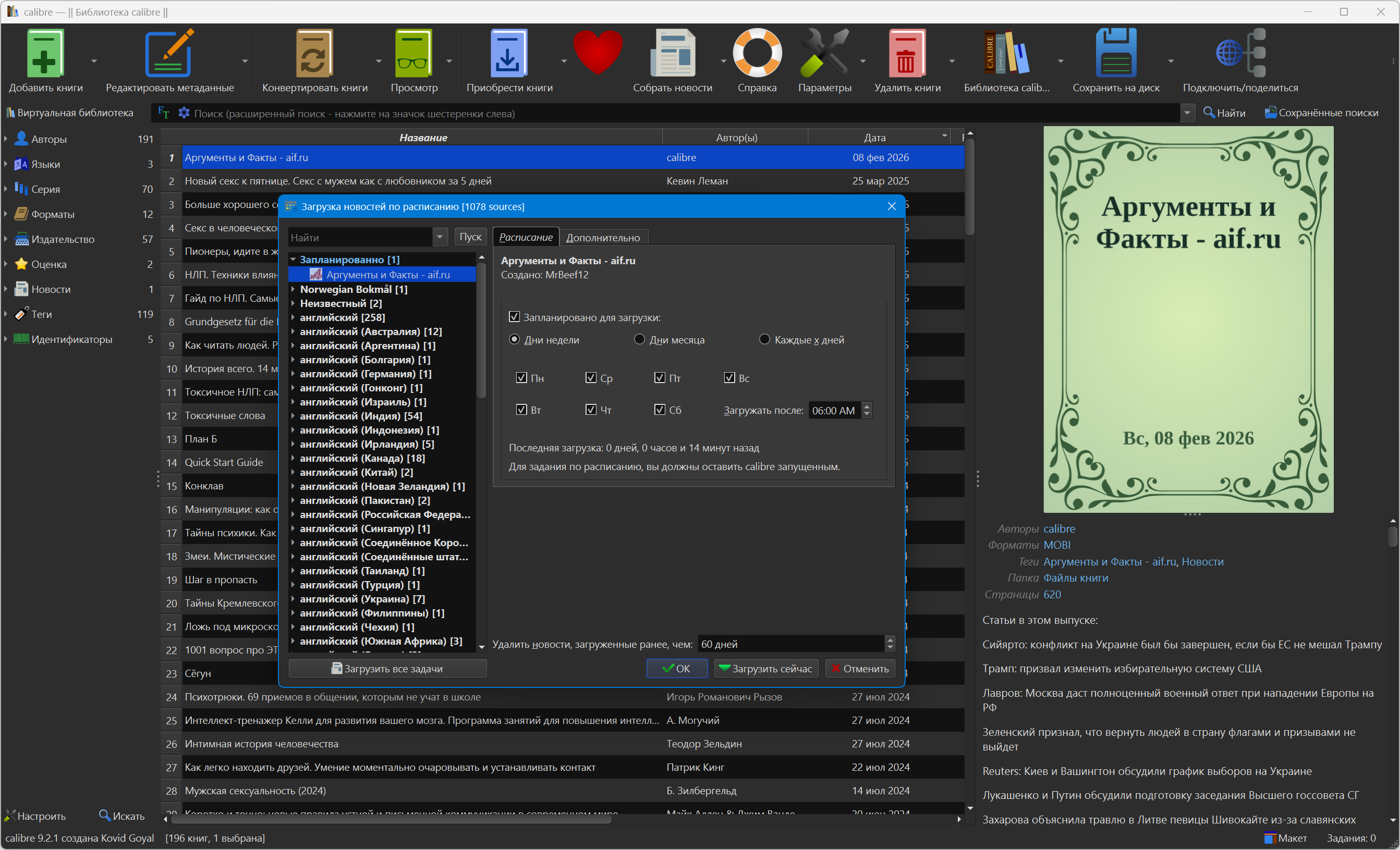 Calibre использует модульную систему драйверов для ридеров, которая позволяет добавлять новые устройства. Программа поддерживает множество устройств. При синхронизации Calibre сама выбирает наиболее подходящий формат или если нет нужного — конвертирует в требуемый. Также добавляет в ридер все нужные метаданные и информацию о сериях книг. Скачивание новостей и конвертация их в книгу Calibre содержит уже 3 сотни источников новостей. И прочитав мануал, вам не составит труда добавить новые источники