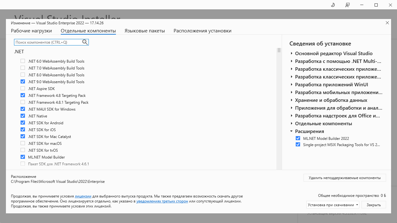 -Для установки Visual Studio требуется .NET Framework 4.7.2 или более поздняя версия . (Для установки Visual Studio версии 17.8 и более ранних версий требуется .NET Framework 4.5.2 или более поздняя версия.) Для работы Visual Studio требуется .NET Framework 4.8. Если .NET Framework 4.8 ещё не установлен, он будет установлен во время установки.