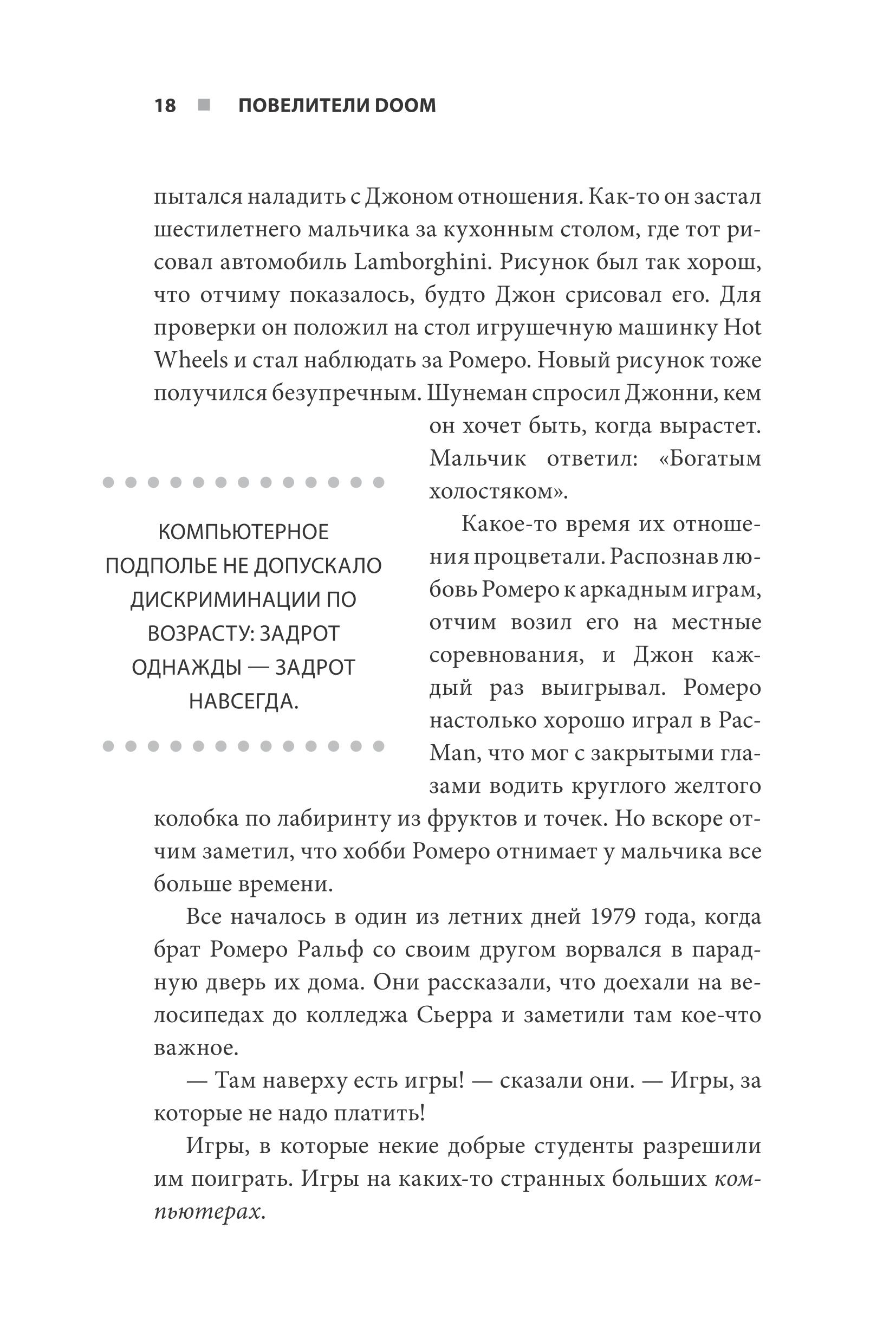 Описание:В 2018 году легендарной игре DOOM исполнилось 25 лет. Книга «Повелители DOOM» – это реальная история двух молодых людей, которых объединила любовь к видеоиграм. Им удалось за короткий срок навсегда изменить устои игропрома. За пару месяцев вместе с маленькой командой они создали культовую, революционную игру, которую сегодня любят миллионы геймеров по всему миру. DOOM стал первым шутером от первого лица. Эта книга дает читателям возможность познакомиться с создателями легендарной игрушки – Джоном Кармаком и Джоном Ромеро. Ведомые страстью к видеоиграм, они пришли к успеху без чьей-либо помощи и протекции. На их пути были и взлеты, и падения, после которых было очень сложно подниматься на ноги. Но они шли дальше. И наконец-то пришли к долгожданной мечте. Книга «Повелители DOOM. Как два парня создали культовый шутер и раскачали индустрию видеоигр» рекомендована к прочтению истинным фанатам DOOM и других компьютерных игр.