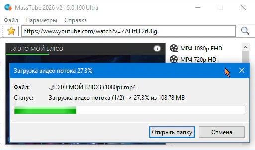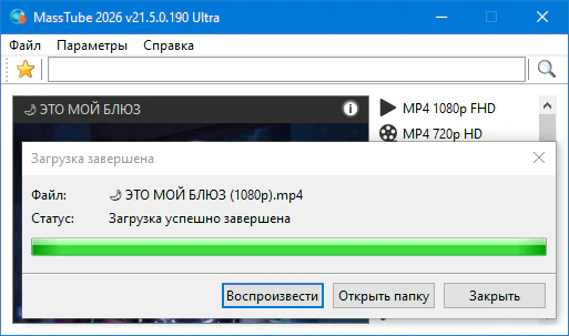 Описание:MassTube — очень простая в использовании программа для скачивания видео с YouTube (и не только) с помощью одного клика. Достаточно в строку поиска вставить адрес понравившегося ролика и нажать поиск, после чего программа предоставит список форматов и разрешений, в которых можно быстро скачать данный клип.