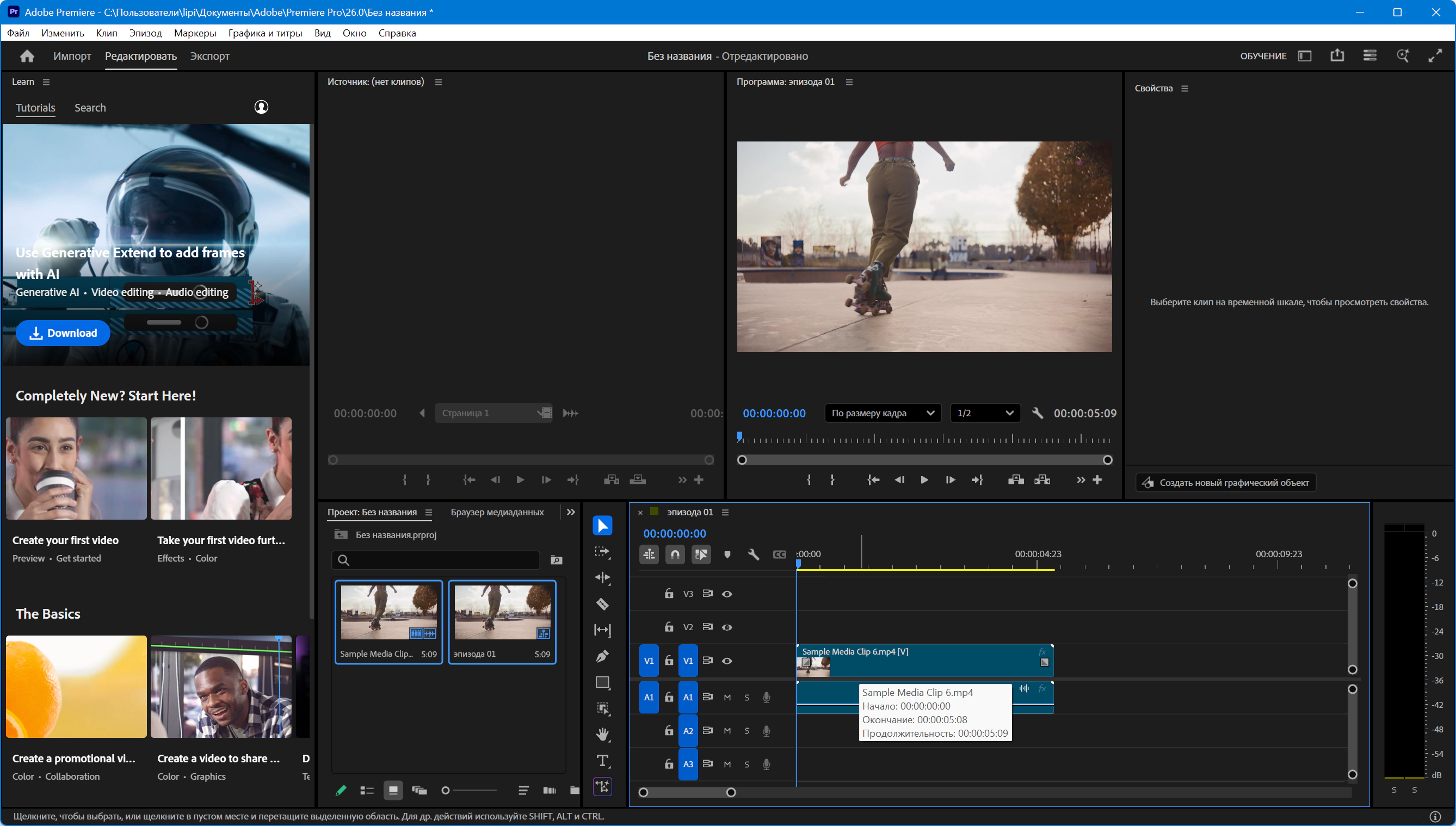 В новом окне запуска начинающие пользователи увидят обзор возможностей приложения, пример обработки видео и руководства, позволяющие быстро создать проект на основе шаблона.
