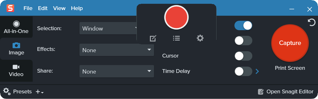 Snagit может автоматически обработать полученный снимок экрана с помощью встроенных фильтров, позволяющих изменить размеры и масштаб изображения, установить нужную глубину цвета, выполнить цветокоррекцию, добавить рамку, тени, водяные знаки, заголовок, и эффекты обрезки краев. Программа также позволяет автоматически переслать обработанное изображение в буфер обмена, на принтер, в выбранное приложение, отправить его по электронной почте или с помощью программы мгновенного обмена сообщениями, а также же сохранить в файл заданного формата, причем имя файла формируется на основе настраиваемых шаблонов.