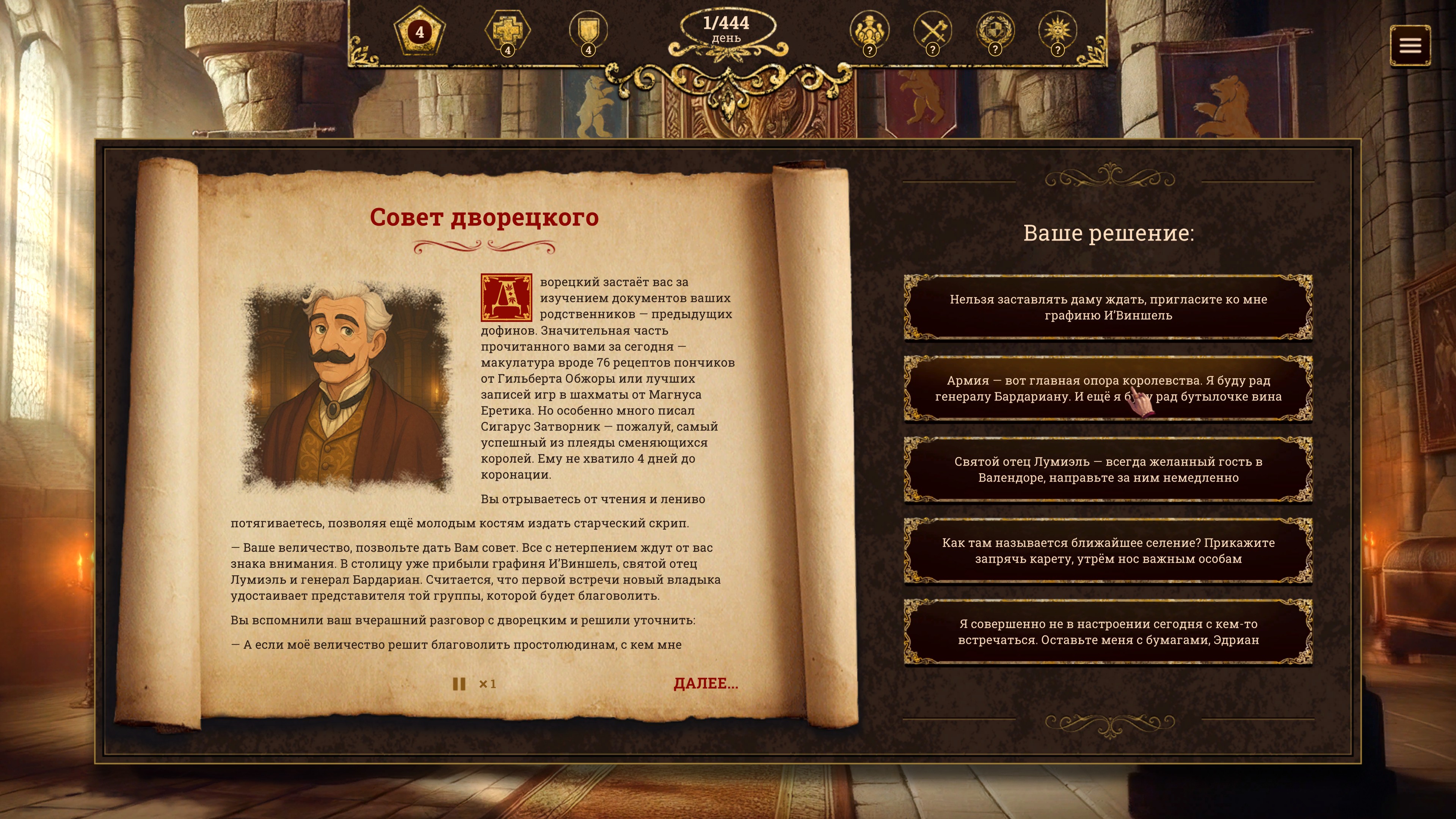 - Развивайте отношения с четырьмя основными группами: аристократией, армией, церковью и простолюдинами. Помните, плохие отношения могут привести к множеству проблем - включая вашу смерть.