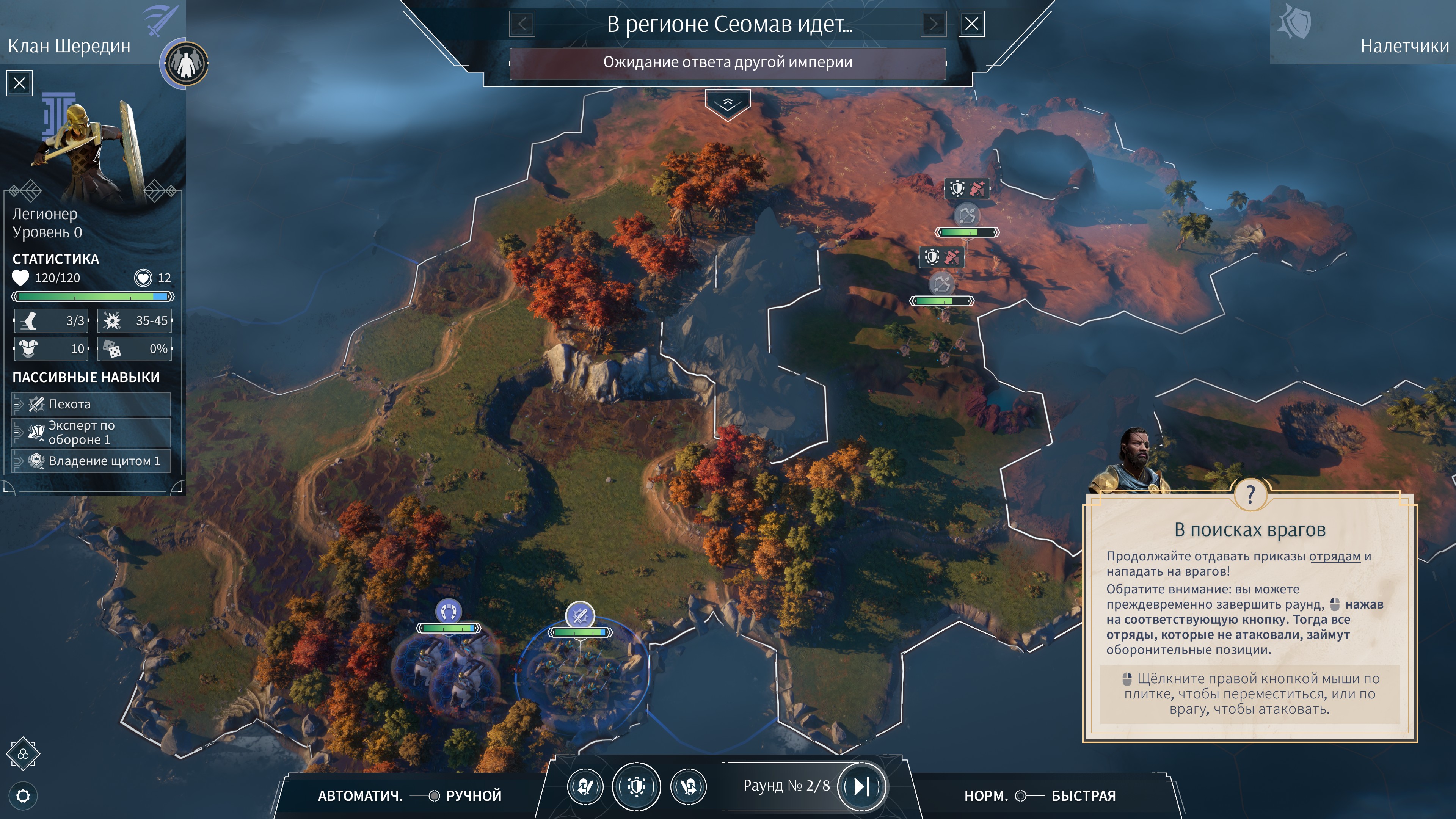 - Вы можете выбрать автоматическое разрешение боя или взять прямое управление отдельными отрядами своей армии, используя местность себе на пользу — контроль ключевых точек, укрытий и возвышенностей даст вам преимущество. У каждой фракции есть не только особые отряды, характеристики, оружие и атрибуты, но и уникальные боевые способности, которые при грамотном применении способны изменить ход сражения. Одной фракции лучше подойдёт терпеливый командир, тщательно маневрирующий войсками для получения мощных бонусов за соседство, тогда как другая делает ставку на численность и подавляющую силу.
