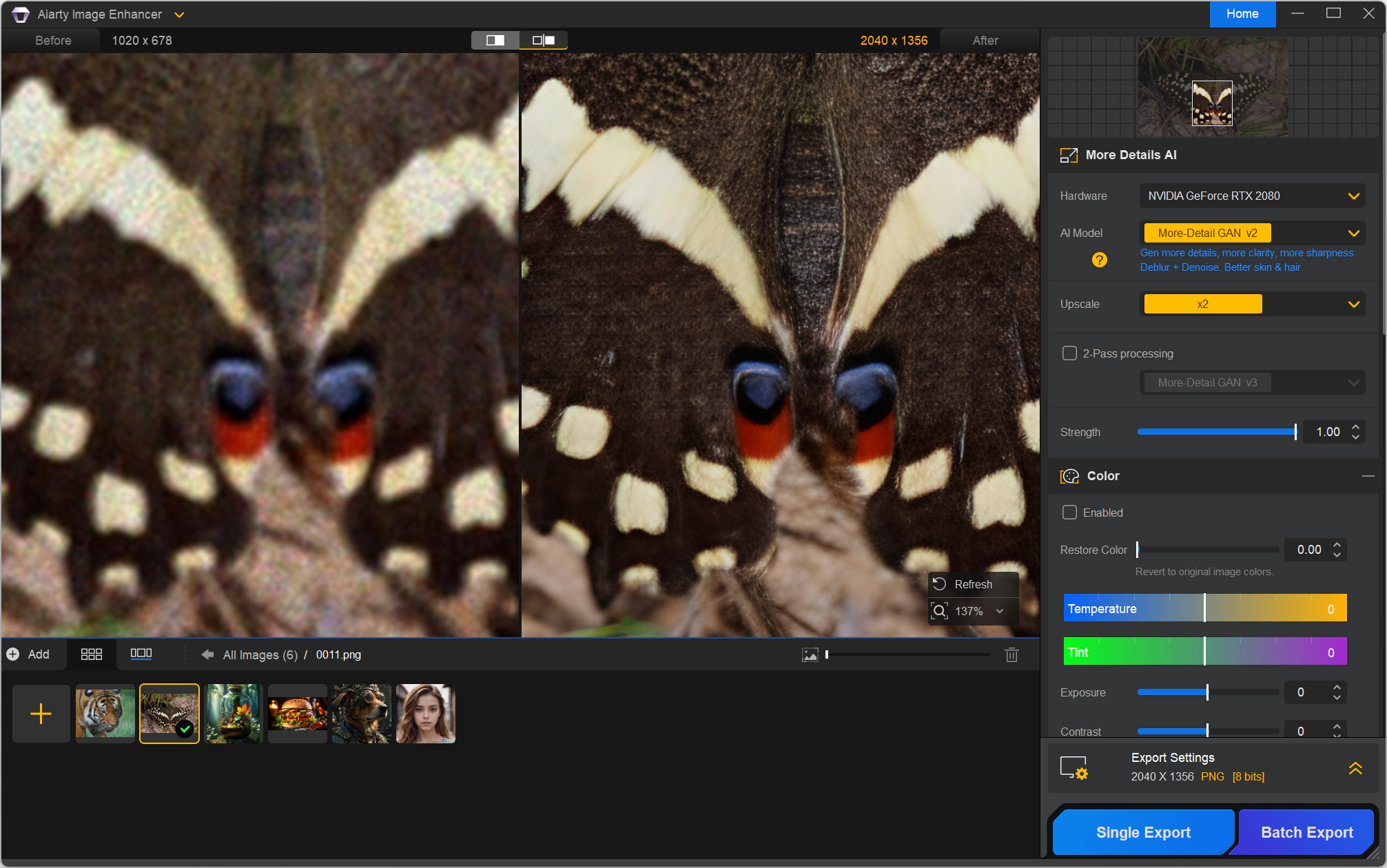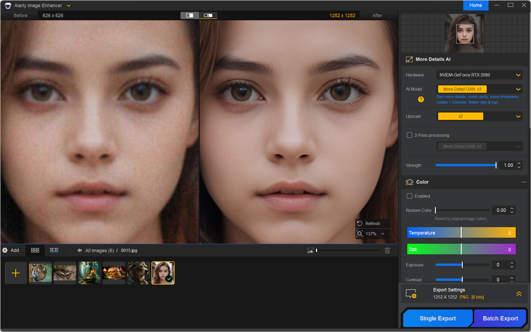 Aiarty Image Enhancer особенно полезен для работы с изображениями низкого качества, включая AI-генерируемые изображения, фотографии и иллюстрации. Он позволяет улучшать детали кожи, волос, тканей и других текстур, делая их более реалистичными и четкими. Программа поддерживает пакетную обработку изображений, что экономит время при работе с большим количеством данных. Поддерживаемые форматы ввода: