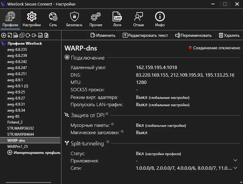 Описание:WireSock Secure Connect - это сложный VPN-клиент WireGuard для Windows, доступный как в командной строке, так и в UI-приложении, предлагающий расширенные возможности, отсутствующие в официальном клиенте WireGuard. Он способствует выборочному туннелированию приложений и исключению конкретных IP-адресов. Разработанный для простоты и удобства использования, Для работы приложения получаем файл конфигурации в генераторе. https://warp-generator.github.io/1. Открываем программу. 2. Жмём на крестик и указываем путь к нашему файлу конфига. 3. Подключаемся.