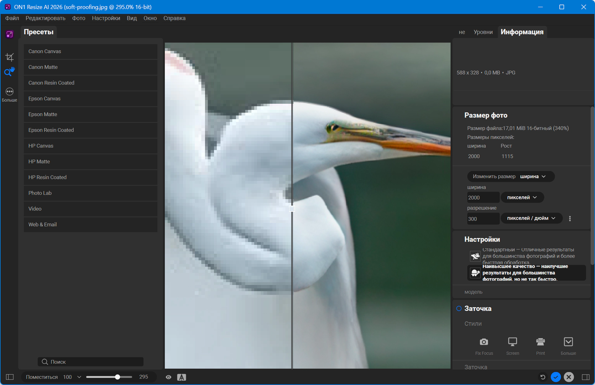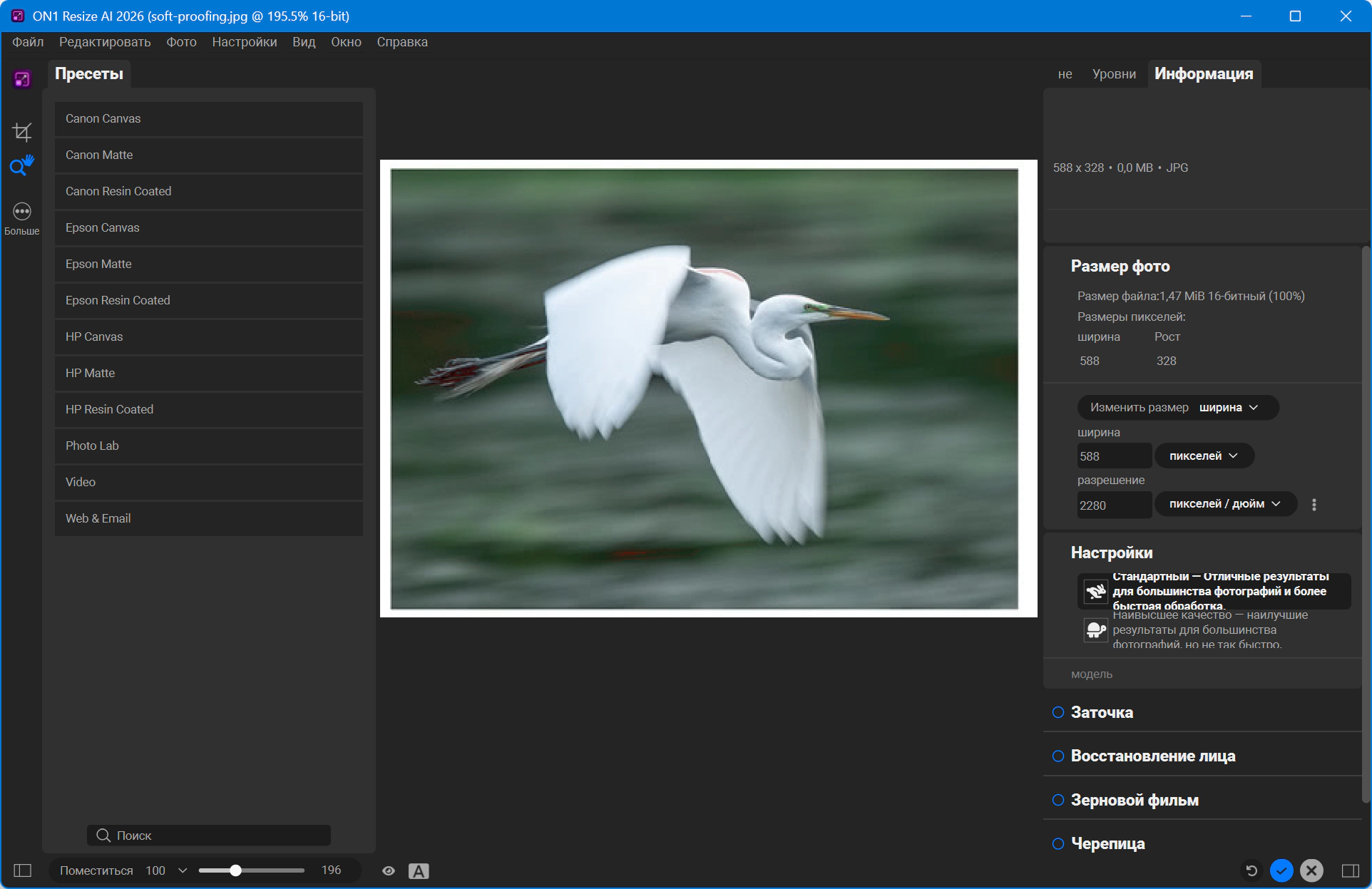 Описание:ON1 Resize AI 2026 — ведущее в отрасли программное обеспечение для изменения размера изображений, позволяющее создавать впечатляющие и высококачественные увеличенные фотографии. Благодаря передовому ИИ с суперразрешением, оно позволяет фотографам увеличивать изображения до 10 раз, сохраняя и даже улучшая детализацию, резкость и чёткость контуров. Независимо от того, готовите ли вы отпечатки, увеличиваете кадрированные изображения, увеличиваете масштаб изображений, созданных с помощью ИИ, или восстанавливаете старые изображения, Resize AI обеспечивает непревзойденные результаты без артефактов и размытия.