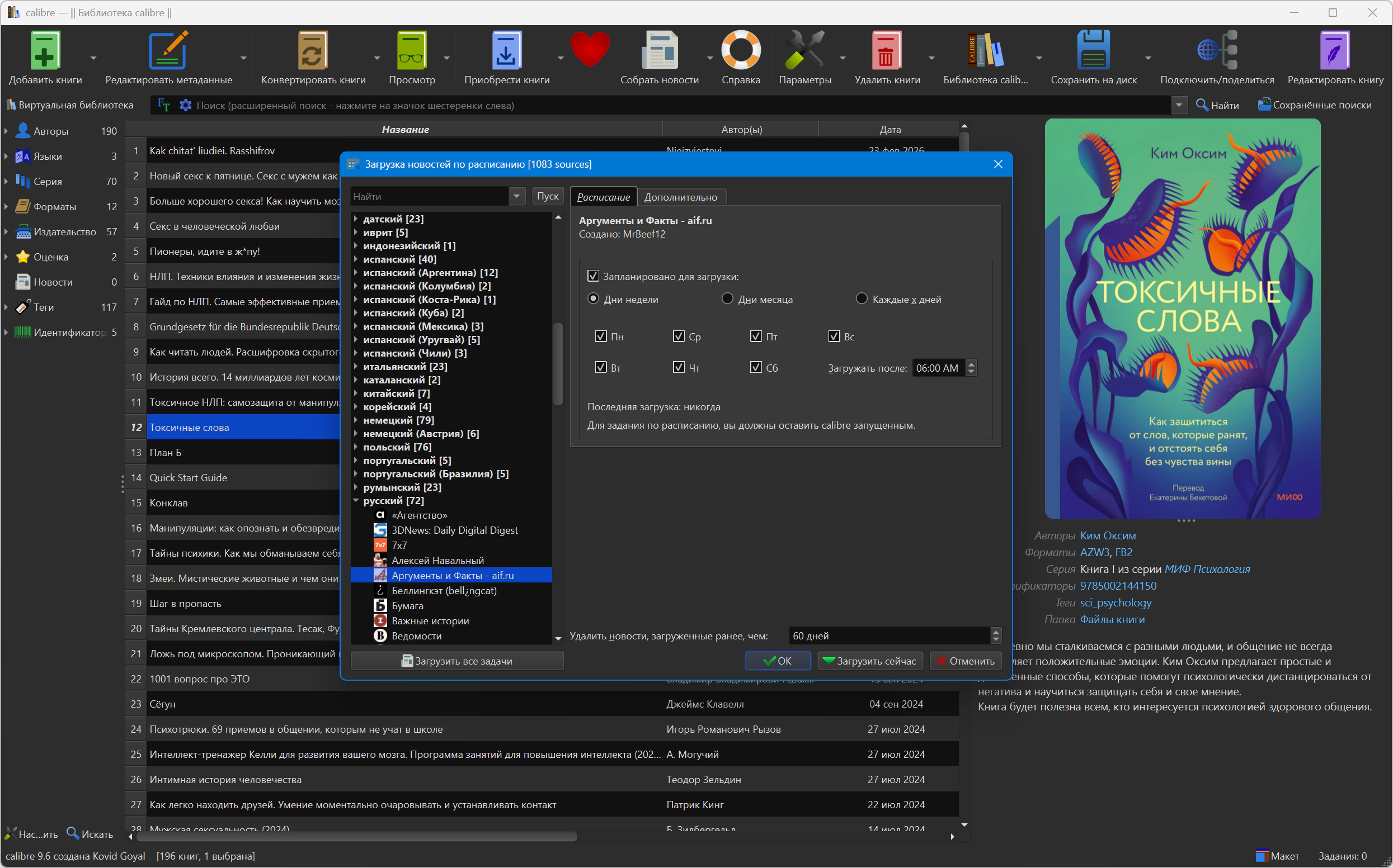 Calibre использует модульную систему драйверов для ридеров, которая позволяет добавлять новые устройства. Программа поддерживает множество устройств. При синхронизации Calibre сама выбирает наиболее подходящий формат или если нет нужного — конвертирует в требуемый. Также добавляет в ридер все нужные метаданные и информацию о сериях книг. Скачивание новостей и конвертация их в книгу Calibre содержит уже 3 сотни источников новостей. И прочитав мануал, вам не составит труда добавить новые источники