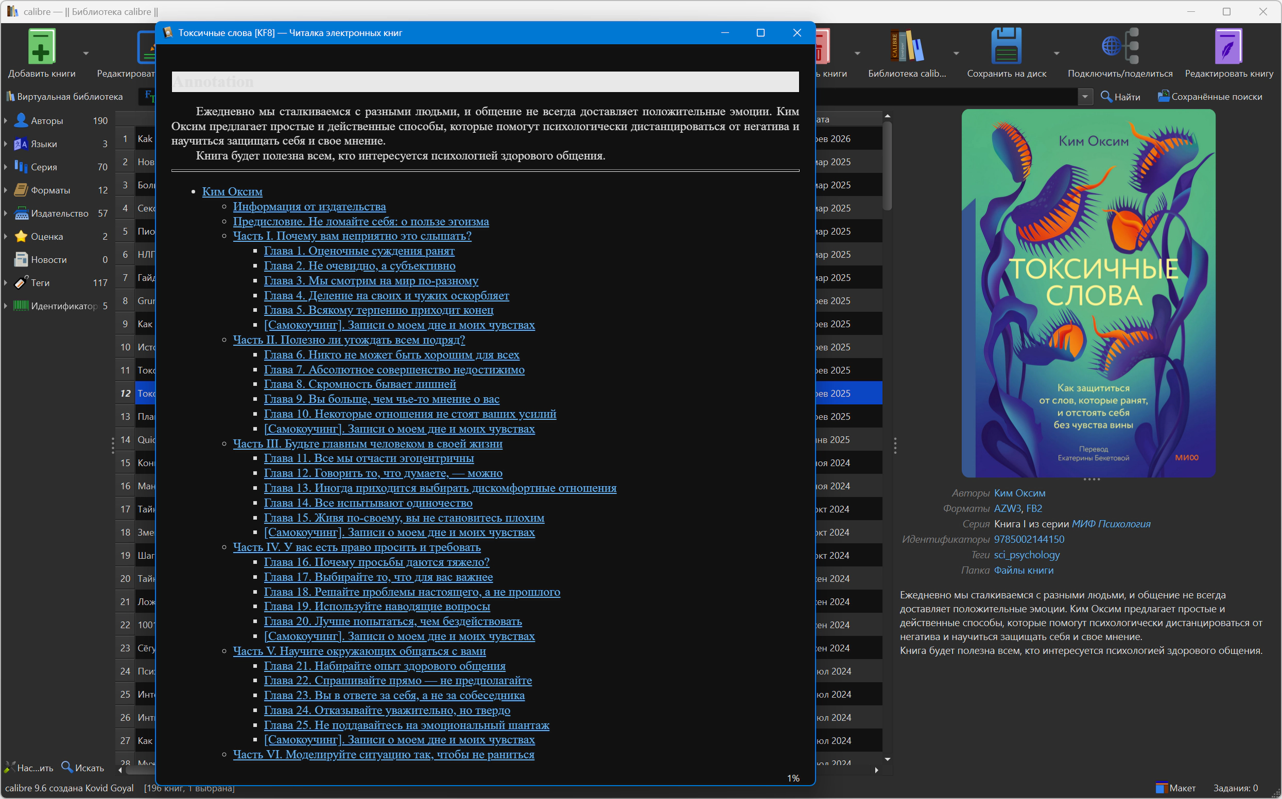 Версия программы: 9.6.0 Официальный сайт: Kovid GoyalЯзык интерфейса: Русский, Английский и другие Лечение: не требуется Системные требования: Описание:Calibre - простая и удобная программа для управления библиотекой и универсальный конвертер электронных книг с большим количеством возможностей. Программа поможет упорядочить вашу библиотеку книг без особых трудностей. Также в её состав входят: утилита для преобразования одного формата в другой, интегратор новостей, программа для синхронизации данных с электронным устройством для чтения и хороший просмотрщик. Она просто необходима поклонникам чтения книг на переносных мобильных устройствах. - Управление библиотекой