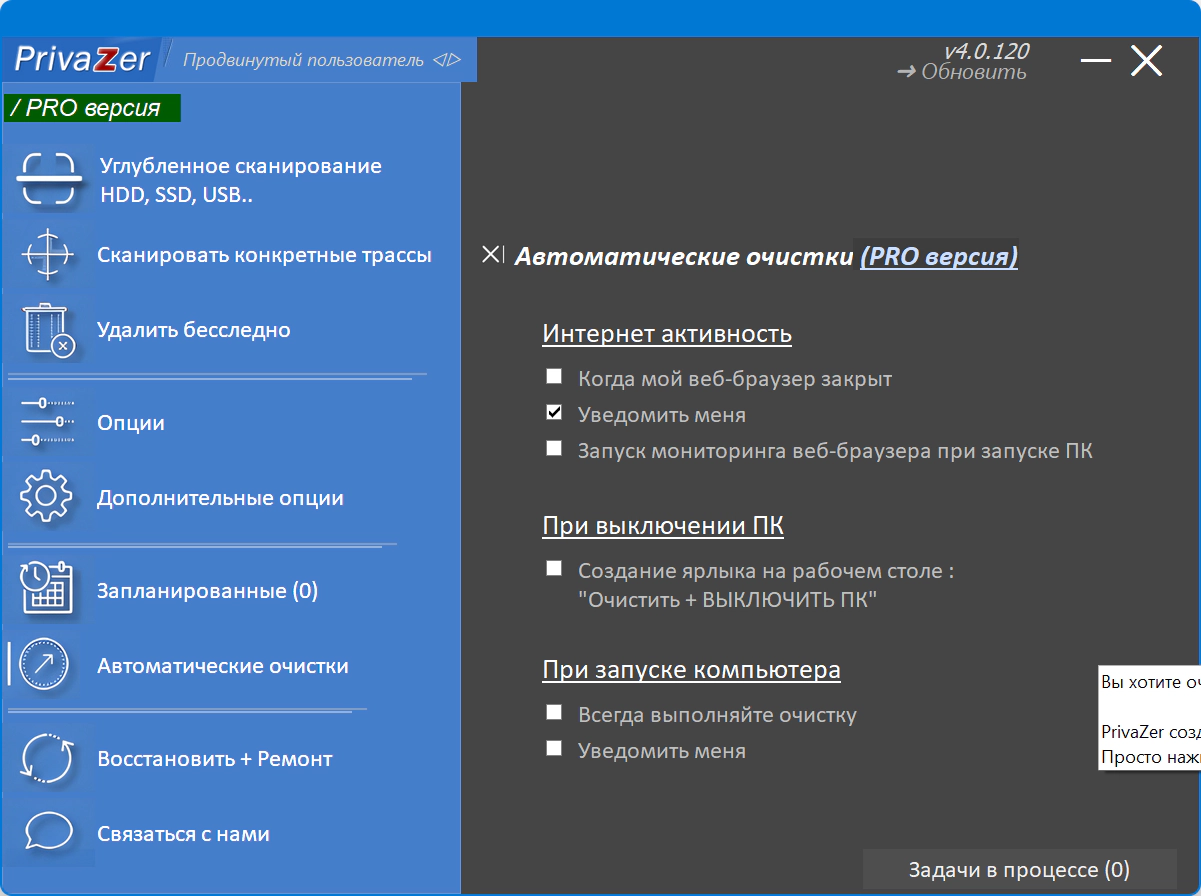 Более 100 анализов и очистки Одним щелчком мыши PrivaZer может безопасно очищать
