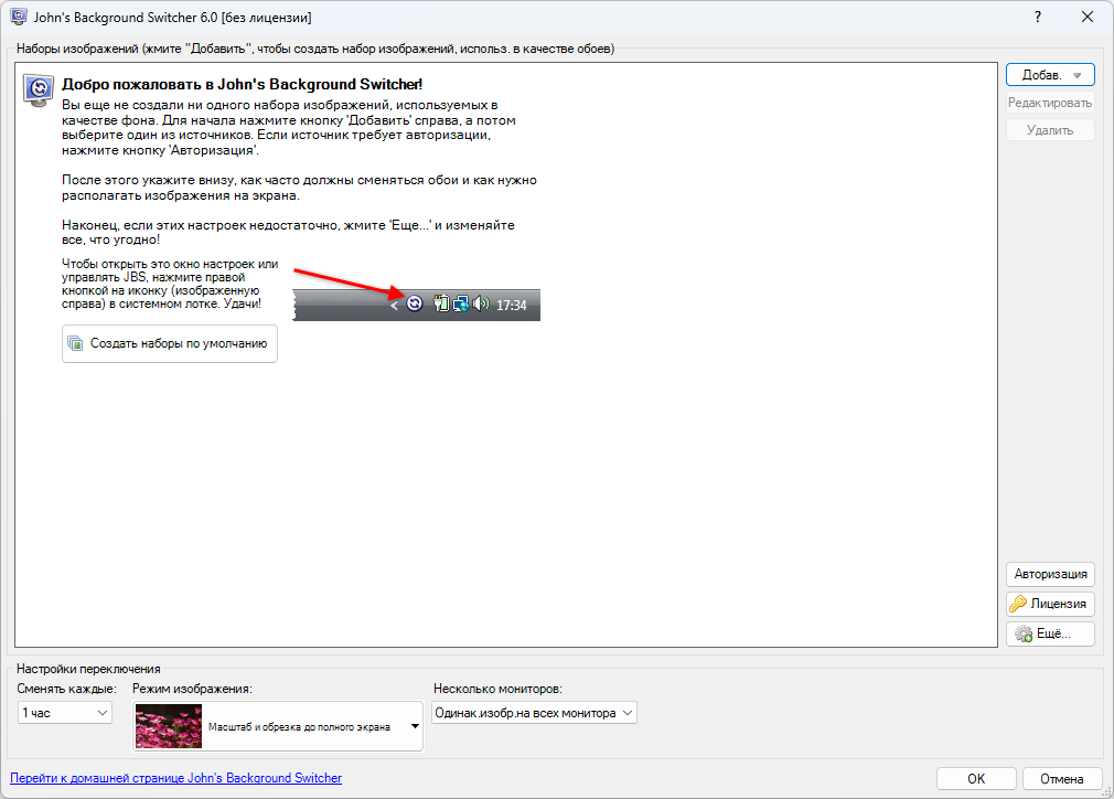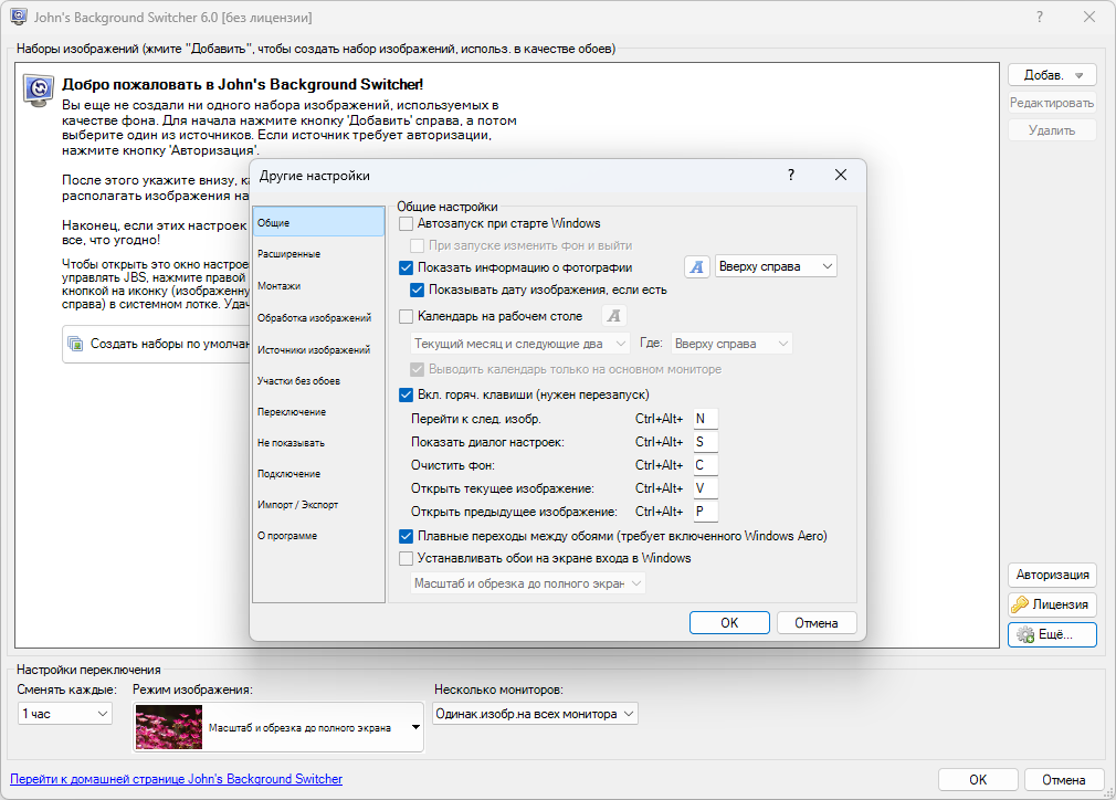 Работать с John’s Background Switcher просто. В основном окне вы можете выбрать источники, способ отображения, задать периодичность обновления, авторизироваться на сайтах источниках, настроить поведение для вторичных мониторов. Дополнительные настройки доступны в отдельном диалоговом окне по кнопке «Еще...», там вы можете настроить почти все, что душе угодно. Может быть, вы хотите 3-месячный календарь на рабочем столе, применить эффект сепии, добавить исключения в ранее избранных папках, назначить горячие клавишы или участки экрана без обоев - все это там есть. Если это не так, пишите автору, говорит, что добавит! Контекстное меню кнопки в трее.Значок John’s Background Switcher в трее позволяет открыть управляющее меню в котором доступны: старт / пауза смены обоев, просмотр текущего изображения, перерисовка, возврат к предыдущему, прыжок к следующему, в список исключения «Больше не показывать», сохранение текущего (полезно для удачных мозаик и понравившихся фото из сети), отправить в твиттер или по эл. почте. Перевод.John’s Background Switcher в настоящее время доступен на английском, французском, немецком, испанском, итальянском, голландском, японском, русском, финском, упрощенном и традиционном китайском (программа выбирает язык на основе текущего языка Windows). Если вы не хотите, что бы программа выходила в интернет, достаточно удалить из списка наборов изображений (главное окно) все сетевые ресурсы и снять галку с опции настроек "Проверять обновления" (под кнопкой «Еще...»). John’s Background Switcher совершенно бесплатен, работает на версиях Windows 10 и 11. Для работы требуется Microsoft.NET 4.8, если его нет, то мастер установки загрузит и установит его для вас. В процессе установки вы можете выбрать дополнительные опции: установить для всех, ярлыки, английский help и языки. Если у вас установлена одна из предыдущих версий программы, просто запустите инсталлятор и он обновит программу без необходимости деинсталлировать вашу версию! Деинсталлятор программы вычищает все компоненты John’s Background Switcher с компьютера не оставляя ни единого следа. *Вы также можете использовать портативный вариант JBS на случай, если вы не сможете запустить установщики в своей системе. Обратите внимание, что при использовании портативного варианта, JBS не сможет изменить экран блокировки, если вы не запустите приложение JBS от имени администратора с параметром командной строки «DoSetupStuff» (без кавычек), что делает установщик. Портативный вариант фактически не является портативным, так как программа прописывается в операционной системе.
