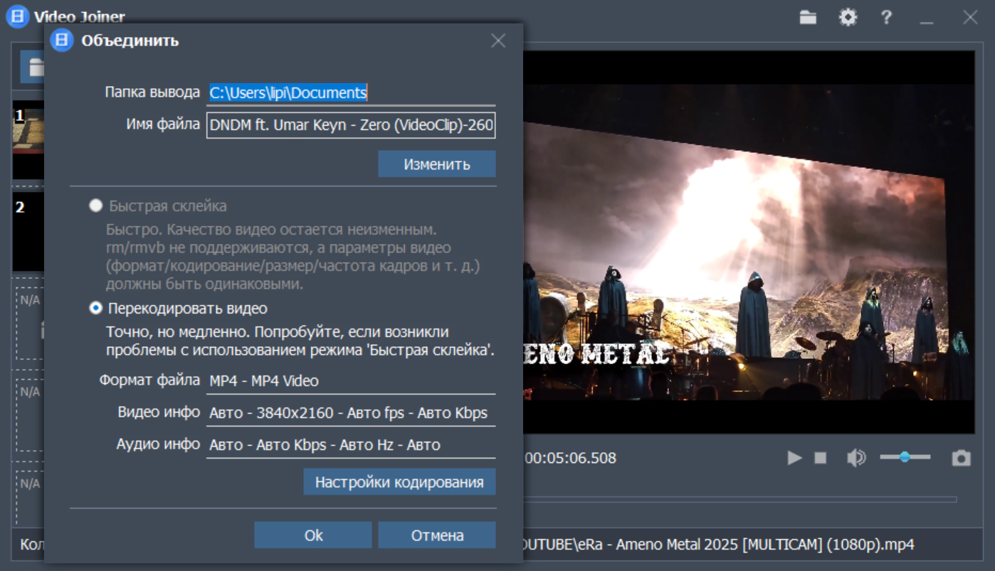 - Объединенное видео может быть в любом видеоформате.