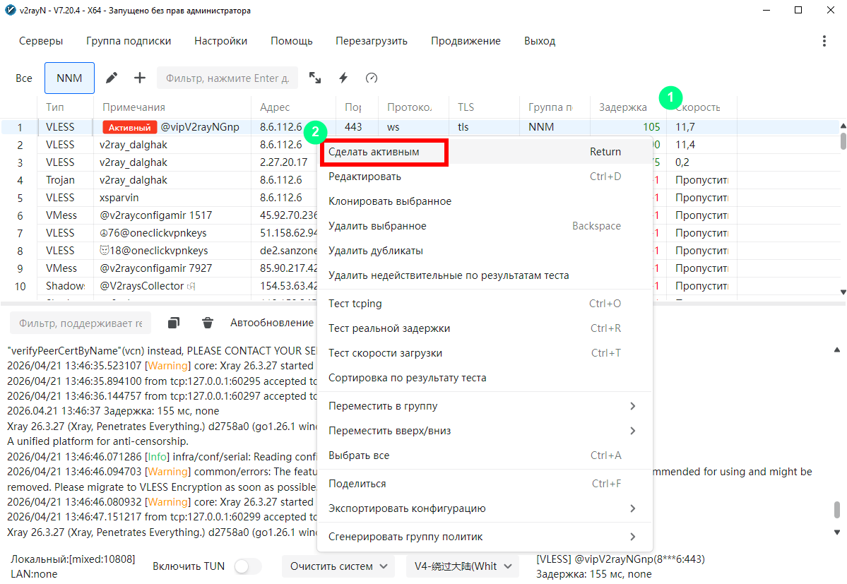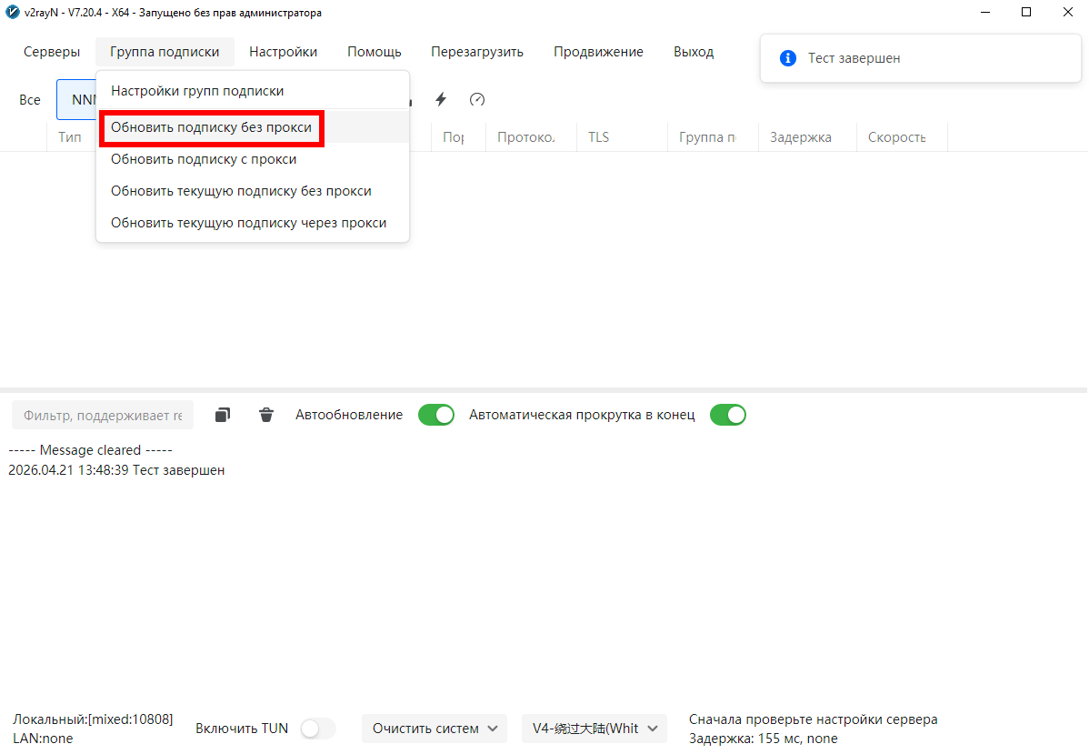 Улучшение проекта V Если вы являетесь пользователем проекта V и, более конкретно, его основного инструмента V2Ray, V2rayN обеспечит вам возможность использовать все его функции просто и легко. Благодаря доступному графическому интерфейсу и открытому исходному коду, V2rayN является безопасным и эффективным. Портативная версия программы предоставлена разработчиком и не требует инсталляции на компьютер. Для непосредственного добавления в программу: | Код: выделить все https://raw.githubusercontent.com/barry-far/V2ray-config/main/All_Configs_base64_Sub.txt |