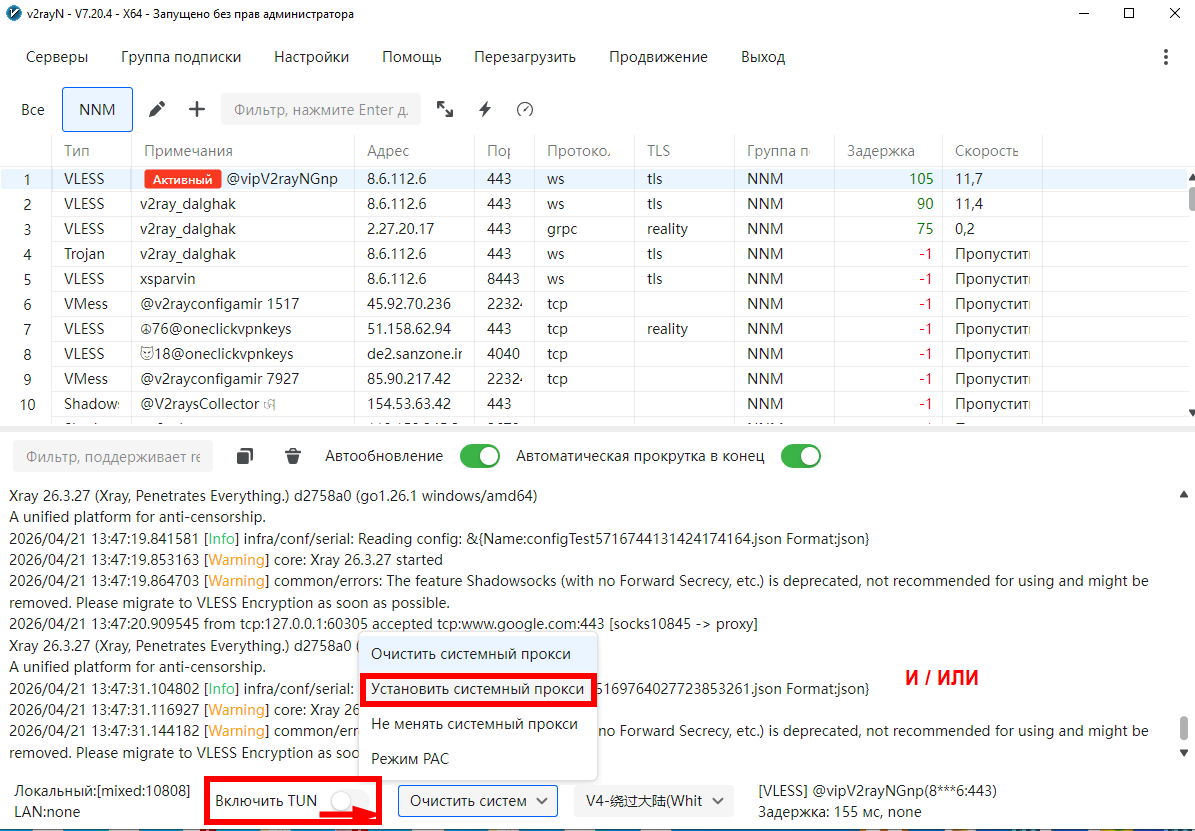 - Далее либо врубаем режим VPN, либо установить системный прокси, либо в нужной нам приложухе прописываем прокси localhost:10808