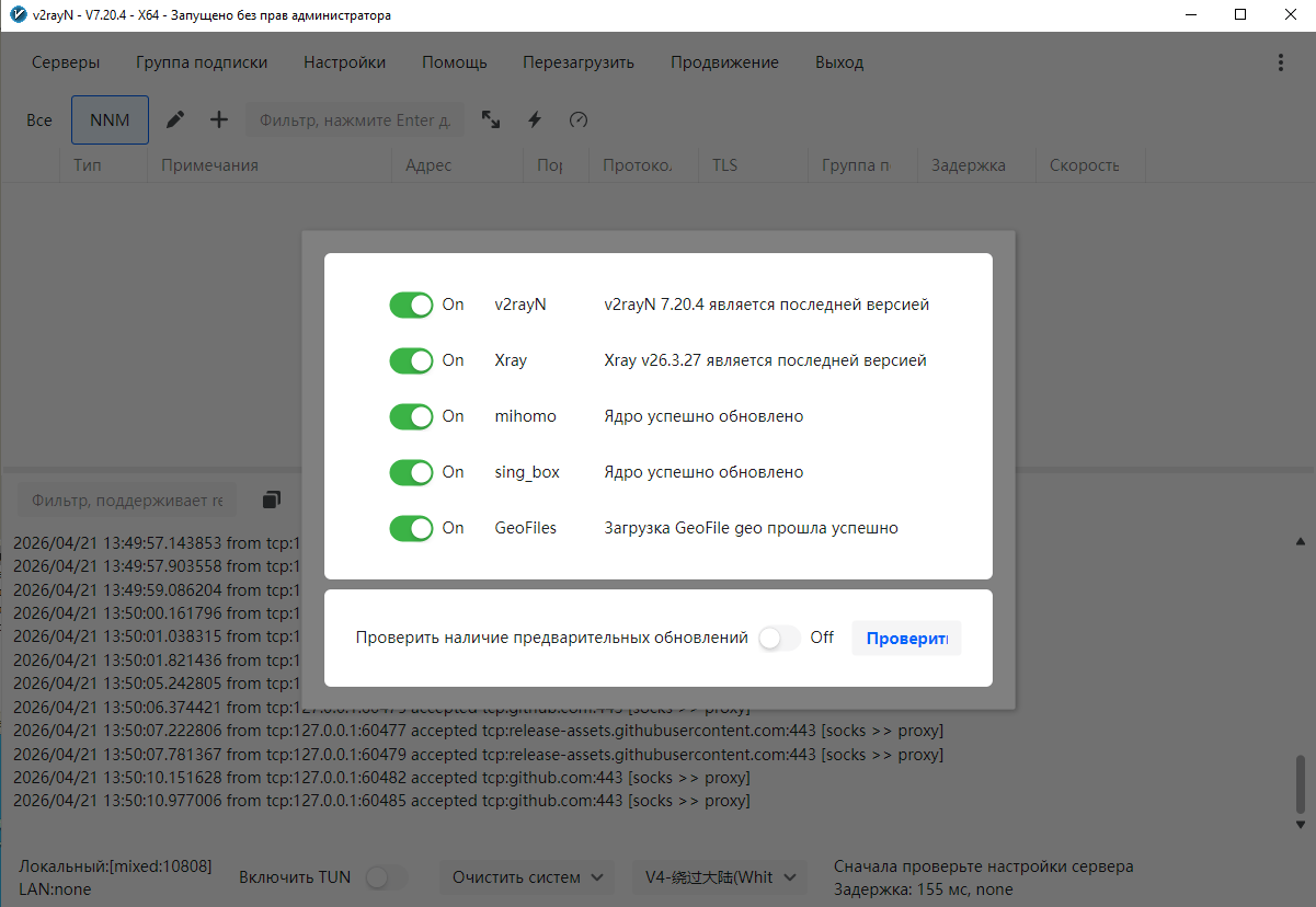 Версия программы: 7.20.4 Официальный сайт: v2rayN | GitHubЯзык интерфейса: Русский, Английский и другие Лечение: не требуется Системные требования: Описание:v2rayN — это универсальный инструмент VPN и прокси, разработанный для устройств Windows. Позволяет пользователям обходить интернет-ограничения, шифровать свои данные и с легкостью получать доступ к контенту ограниченному регионом. Управление вашими серверами V2Ray V2rayN - это бесплатный и открытый клиент для Windows для V2Ray, который предоставляет вам простой интерфейс для управления вашими серверами V2Ray. С возможностью переключения между серверами, настройки правил маршрутизации и мониторинга статуса подключения, V2rayN упрощает использование V2Ray и делает его более доступным. V2Ray является ядром Project V, набора инструментов, разработанных для помощи в создании частной сети через Интернет. V2rayN помогает управлять вашими серверами и обходить интернет-цензуру проще, подобно PuTTy и SoftEther VPN Client.